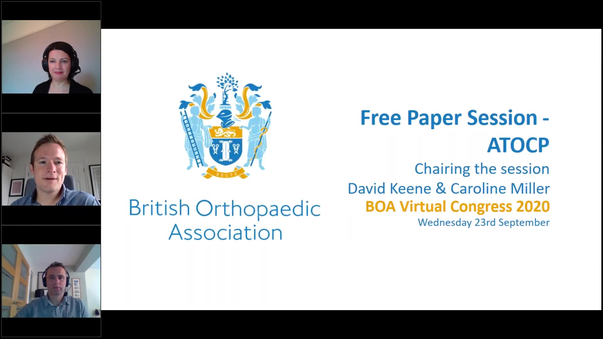 The ATOCP Free Paper Session at the virtual BOA conference is kicked off by David Keene, a researcher from Oxford and a physiotherapist based in Bath. He expresses excitement about the range of projects being presented and appreciates the adaptability of speakers transitioning to an online format. David introduces himself and his co-chair, Caroline Miller, a clinical doctoral research fellow at the University of East Anglia. He notes the continued improvement in the quality and scale of presentations compared to previous years and highlights ongoing research opportunities for trauma orthopedic researchers, including collaborative efforts in surveys, intervention development, and national studies. David also mentions the increase in training opportunities for physiotherapists pursuing research careers and encourages community engagement to promote these initiatives. As he concludes his introduction, he sets the stage for the main session activities.