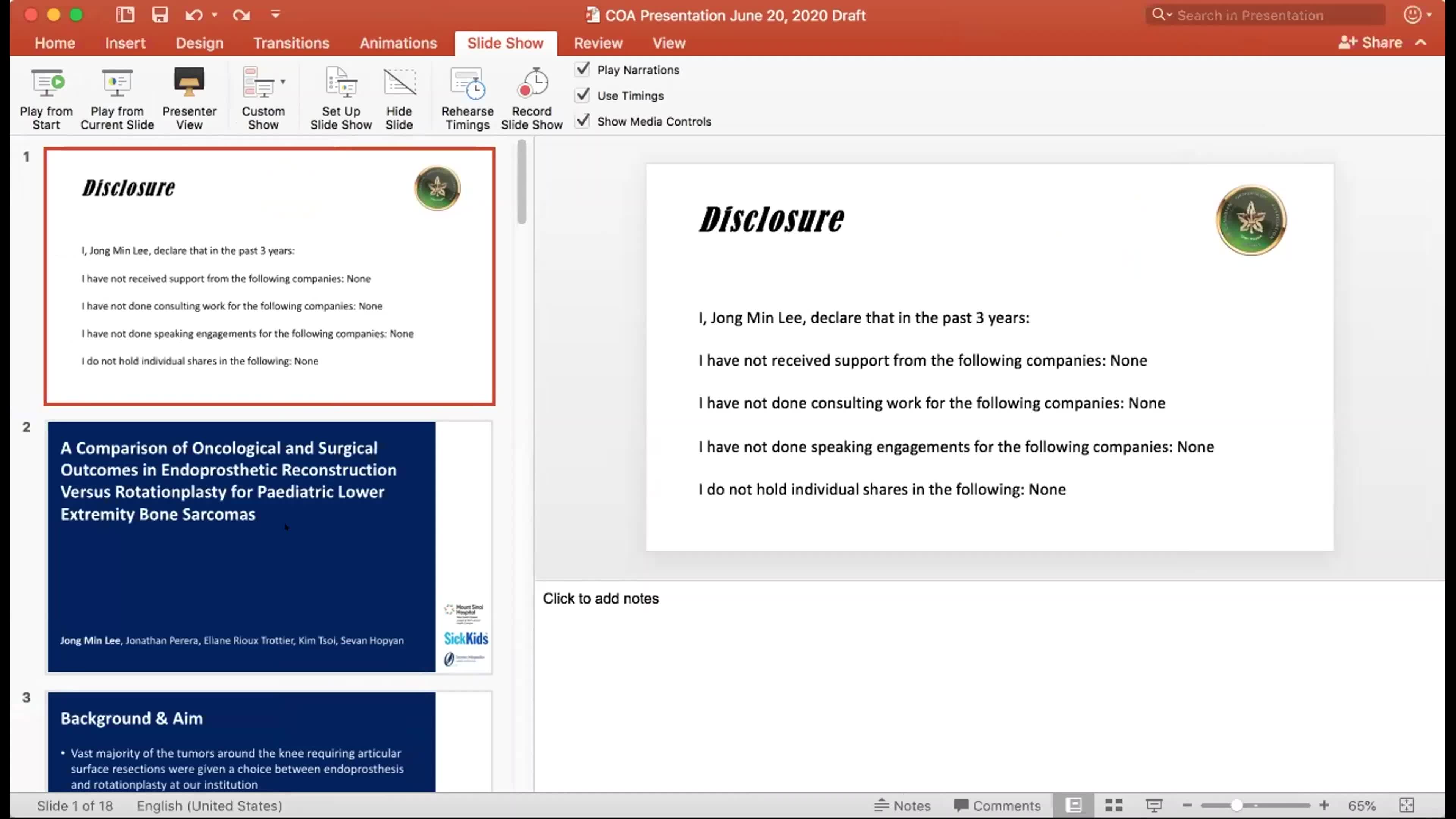 The presentation by Jong Min Lee from the University of Toronto discusses a retrospective review comparing oncological and surgical outcomes of two reconstructive options for knee tumors: endoprosthesis and rotationplasty. Lee presents background information indicating that both reconstructive methods are offered at their institution for tumors requiring articular surface sections. The study included 50 patients, with 26 receiving endoprostheses and 24 undergoing rotationplasty, studying demographics, tumor presentations, and treatment responses over an average follow-up of three to four years.
