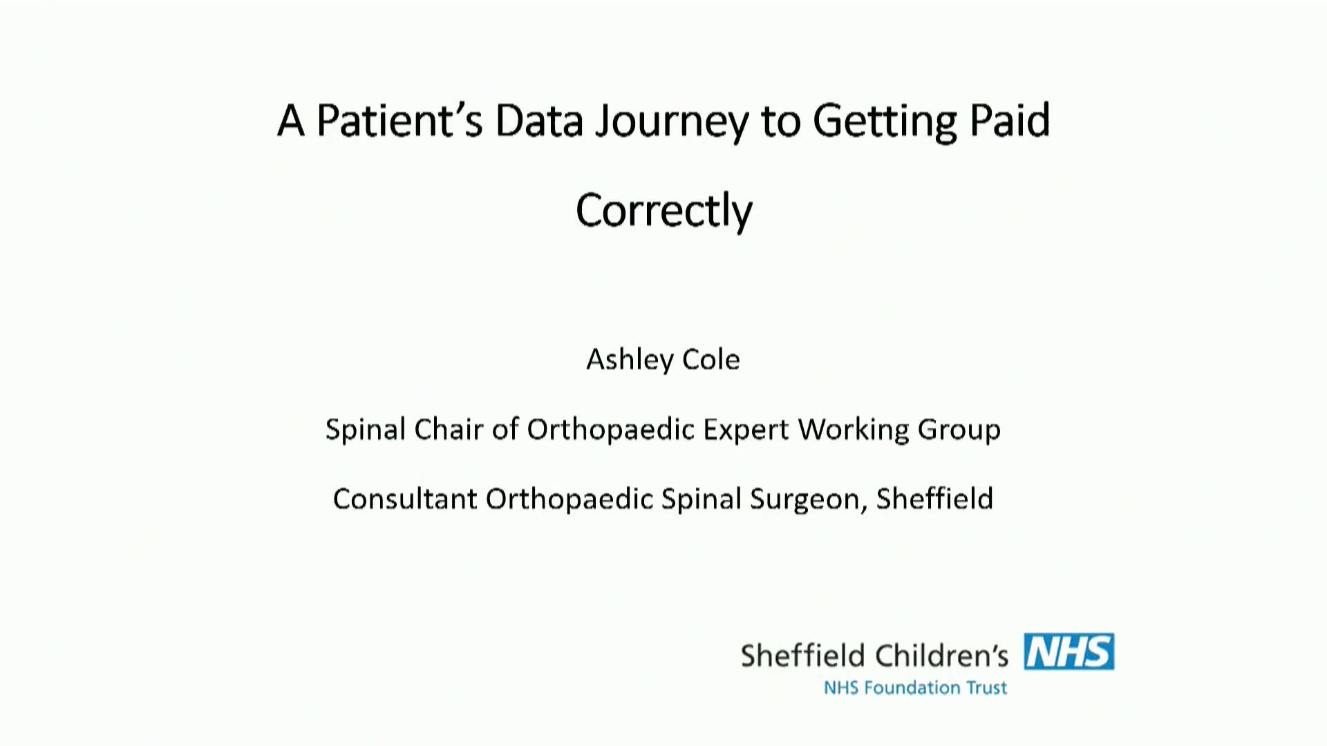 This transcription appears to be an educational lecture given by Ashley Cole, focused on the financial and coding aspects of healthcare, particularly within the NHS (National Health Service) framework in the UK. The talk includes information about how patient care services are funded, with specific emphasis on procedural coding systems such as OPCS (Office of Population Censuses and Surveys) and HRG (Healthcare Resource Group).