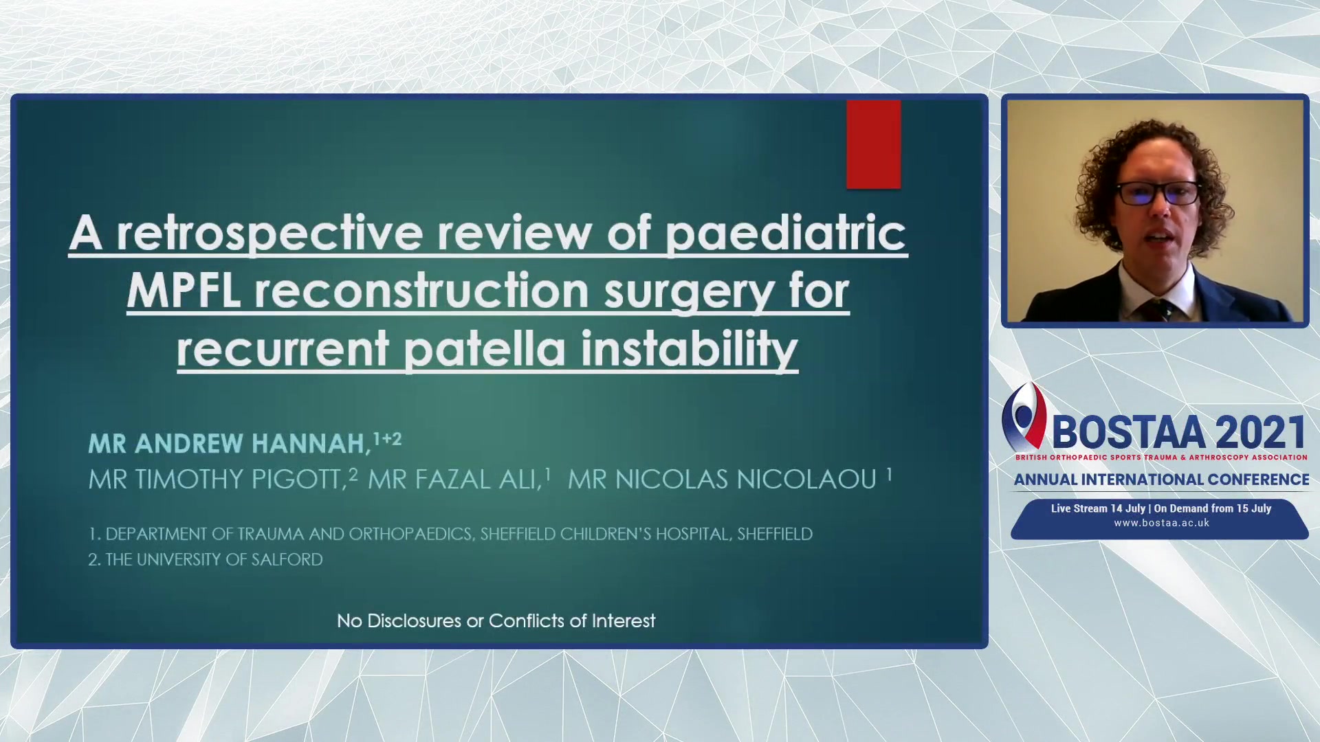 Andrew Kannah presents a study on MPFL reconstruction surgery, addressing its efficacy in children. He outlines the surgery's recommendation for recurrent dislocation and highlights the lack of specific guidance on the necessity for additional alignment procedures. The presentation discusses a retrospective review involving patients under 18 who underwent MPFL surgery, detailing the success rates, survey results, and various risk factors including BMI and trochlear dysplasia. Key findings include that higher TT-TG distances and greater indications of patella outer led to better quality of life improvements. Despite a low revision rate, patients with severe dysplasia and high BMI had poorer outcomes, prompting the recommendation for further weight management pre-surgery. Limitations of the retrospective design and consent requirements are noted, alongside a summary of references.