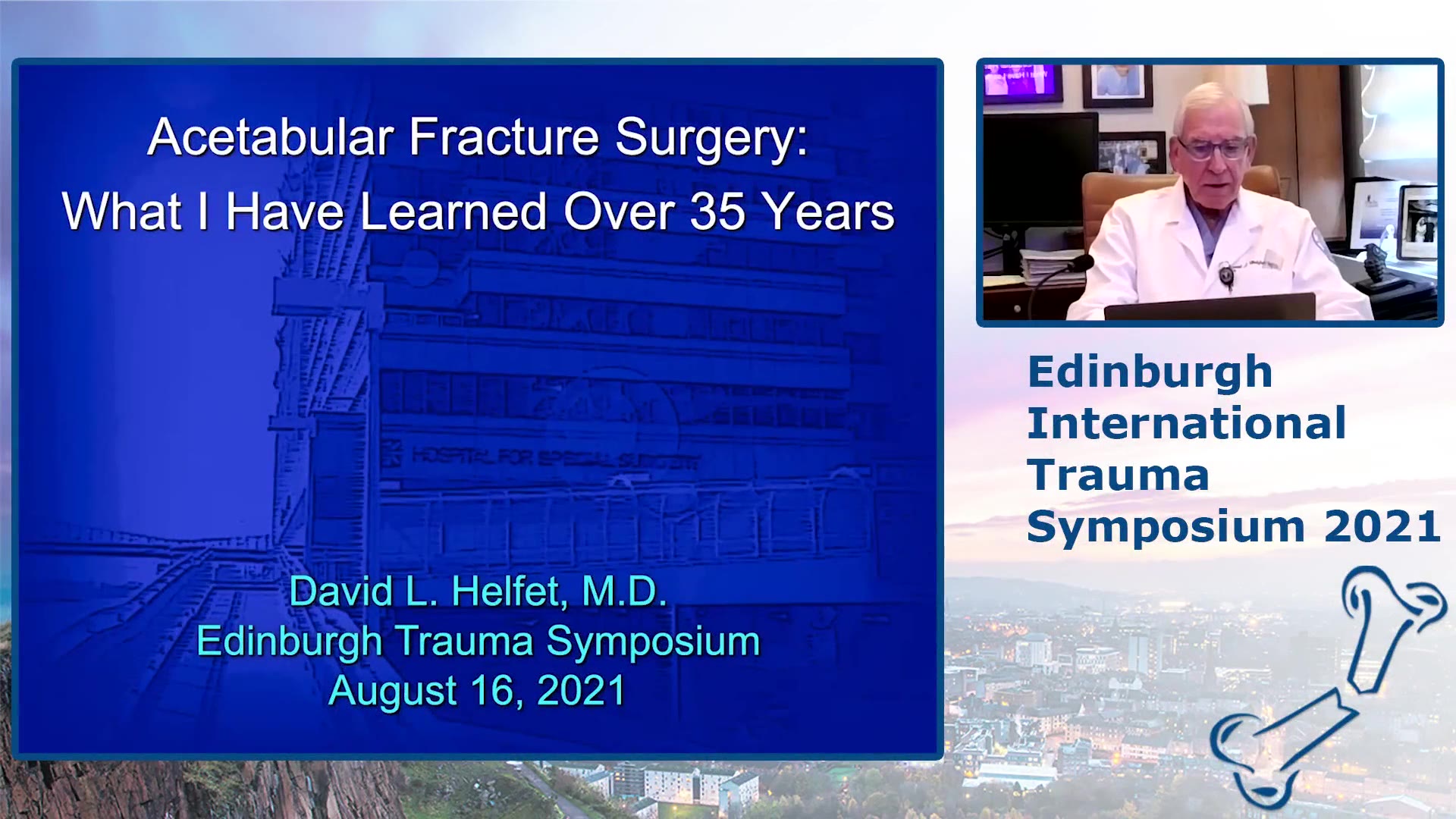 The presentation is by Dr. David Helfet, an esteemed orthopedic surgeon discussing the nuances of acetabular fractures, their management, and surgical techniques honed over 35 years of experience. He opens with gratitude for the opportunity to speak at a symposium named after Baron Lister, a surgical icon, before transitioning into a detailed exploration of complex acetabular fractures.