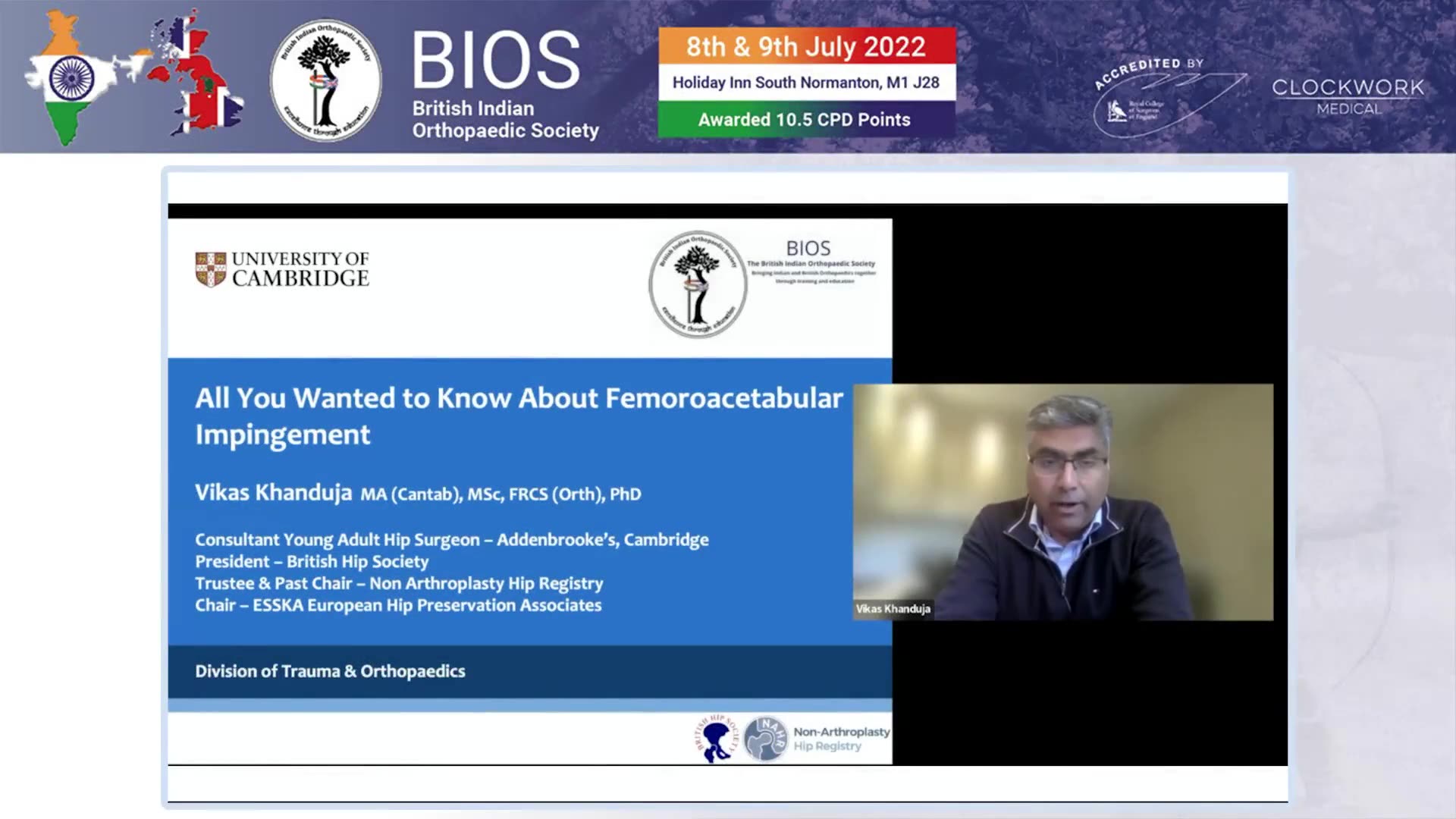 The presentation, delivered by Vikas Khanduja as part of the BIOS program, focuses on femoroacetabular impingement (FAI), a condition affecting the hip joint characterized by pain due to abnormal contact between the femoral neck and the acetabular rim. Khanduja expresses his gratitude to the organizers and shares insights on the complexities of FAI, emphasizing the importance of understanding its morphological causes and implications, such as the potential for early osteoarthritis if left untreated. He discusses the historical context of FAI, the increasing recognition of its significance in surgical practice, and recent advances in research and treatment methodologies.