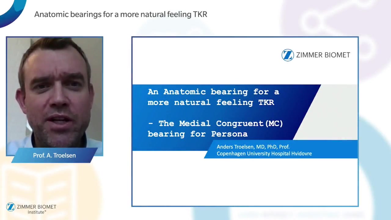 This presentation by Anders Troelsen, a consultant knee arthroplasty surgeon and Professor of Orthopedics in Copenhagen, discusses the advancements in total knee replacement technology focusing on the medial congruent (MC) bearing of the Persona knee system. Troelsen highlights the importance of personalized knee arthroplasty, emphasizing that it aims to provide a more natural feel for patients. He explains that although many knee arthroplasty cases may be treated with unicompartmental solutions, a significant portion still requires total knee replacement. The Persona knee system, featuring a vitamin E enhanced MC bearing, is noted for its optimized morphometric shapes and high contact area that enhance knee stability and mobility, particularly in the medial compartment.