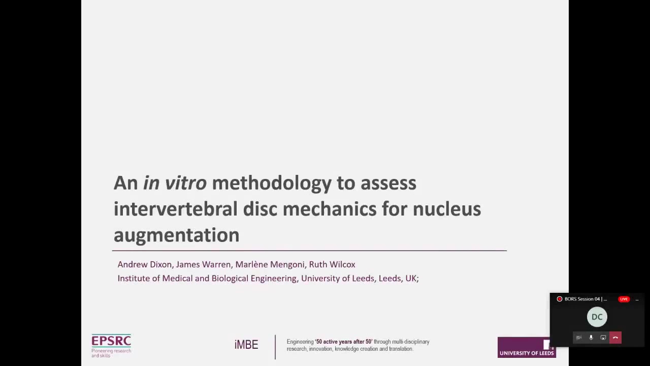 In this presentation, Andrew Dixon discusses his PhD research centered on in vitro methodologies aimed at assessing nucleus augmentation in intervertebral disks. He highlights the prevalence of back pain and degeneration, emphasizing the need for novel treatments hindered by inconsistent in vitro methodologies. The focus of his work involves the complex viscoelastic interactions between the nucleus pulposus and annulus fibrosus in the disks, which are dependent on hydration and time.
