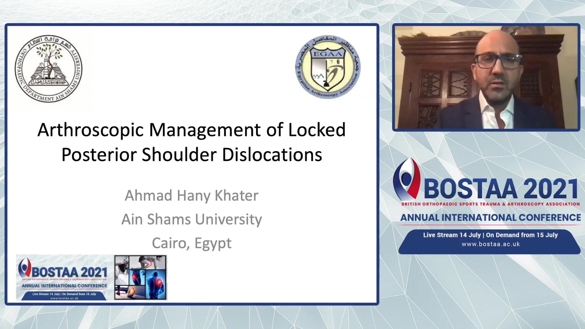 The video transcript features a presentation by Ahmed Hany Khater, an associate professor of orthopedic surgery at Ain Shams University in Cairo, Egypt, during the BOSTAA 2021 Annual International Conference. The talk focuses on managing locked posterior shoulder dislocations arthroscopically.