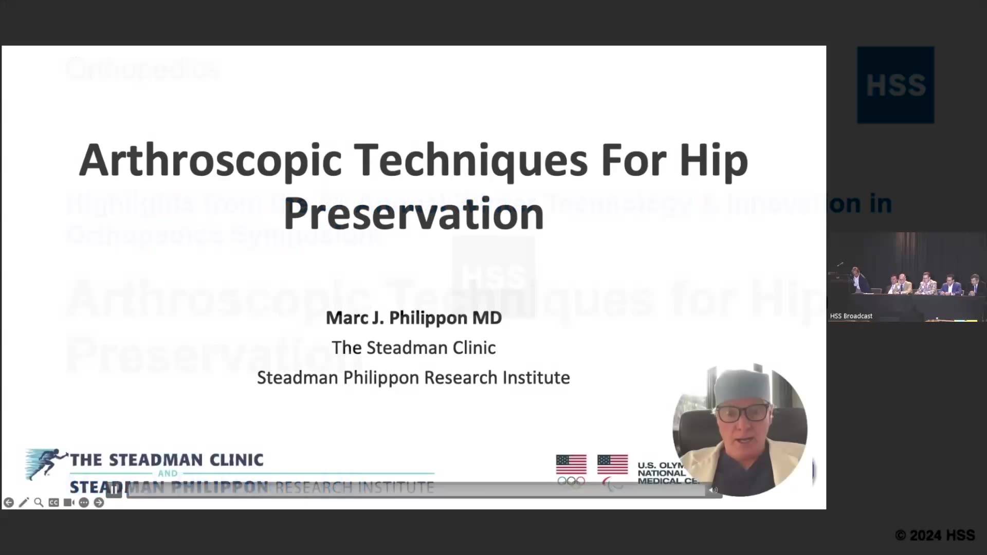 In this presentation, Dr. Marc Philippon discusses arthroscopic techniques for hip preservation, particularly focusing on the treatment of femoroacetabular impingement (FAI), which is a significant contributor to premature arthritis in patients. He explains the two types of FAI - cam and pincer types, highlighting their effects on the hip joint and associated conditions. Dr. Philippon emphasizes the importance of patient selection and outlines a holistic approach to treating FAI, which includes evaluating the labrum, joint capsule, and cartilage pathology, with the goal of addressing bone impingement and stabilizing the hip joint. He describes his method of using dynamic analysis during surgery to ensure adequate resection of cam morphology and proper labral repair techniques. Additionally, he shares findings from his 10-year study on the outcomes of arthroscopic techniques, which demonstrate high patient satisfaction and success rates, stressing the importance of preserving labral height and the significance of joint space narrowing in patient outcomes. Throughout the talk, he reinforces the need for rigorous patient selection criteria and the crucial role of rehabilitation alongside surgical treatment for optimal results.