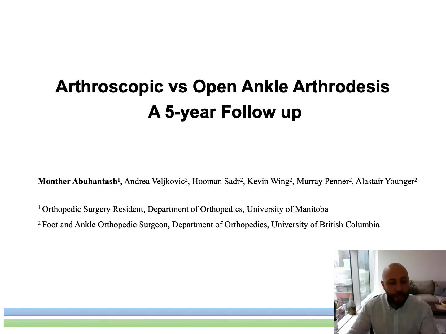 In this presentation, Monther Abuhantash, a PGY1 orthopedic surgery resident at the University of Manitoba, discusses his research project comparing arthroscopic and open ankle arthrodesis in patients with end-stage ankle arthritis. He begins by expressing gratitude to his co-authors and mentors. The presentation highlights the debilitating effects of end-stage ankle arthritis and the distinctions between the traditional open technique and the newer arthroscopic approach, emphasizing the potential benefits of the latter including shorter recovery times and reduced morbidity.