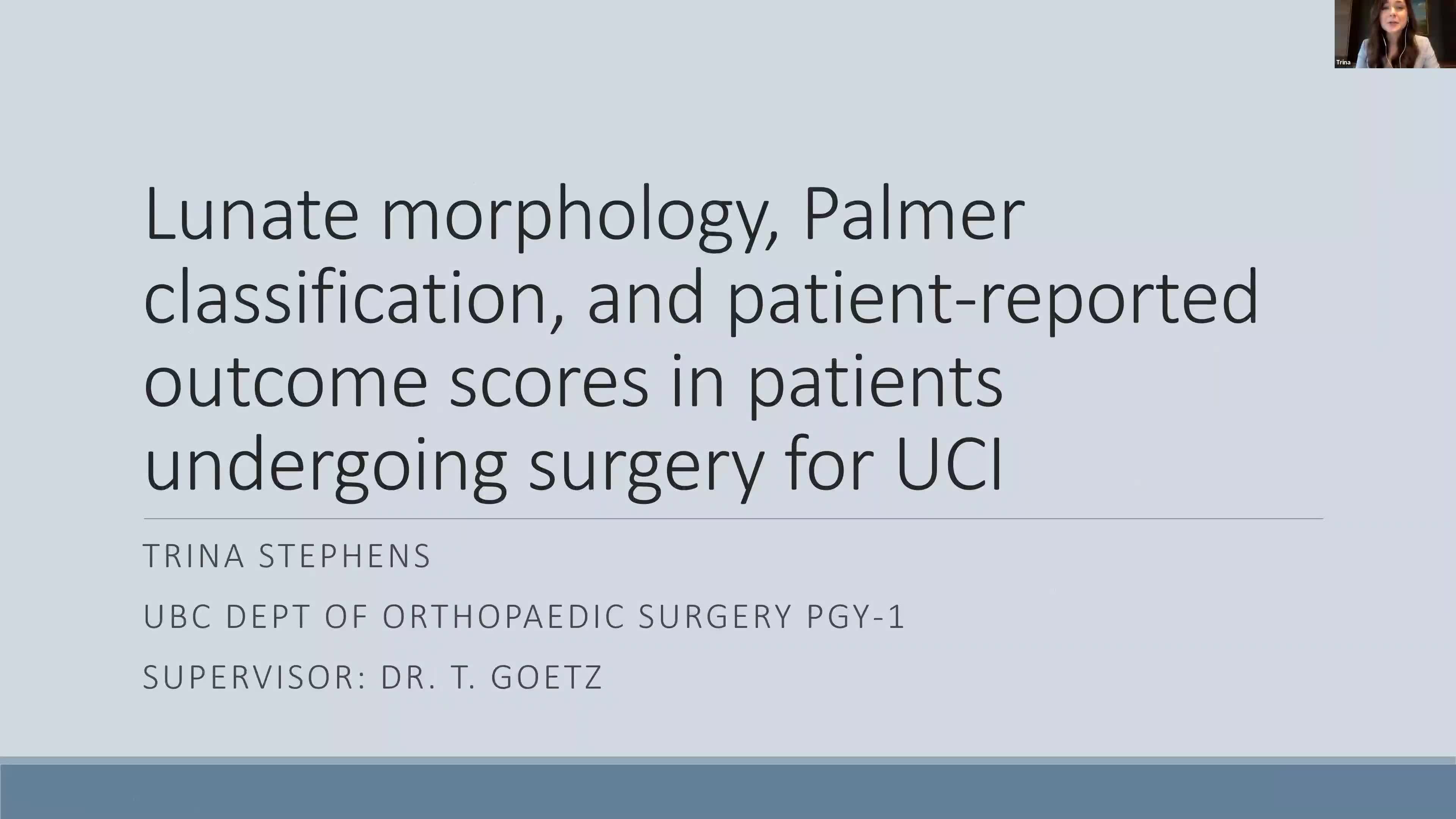 The transcript is from a presentation by Trina Stephens from the University of British Columbia, outlining a study on lunate morphology, palmar classification, and patient-reported outcomes in the context of ulnocarpal impaction surgery. It begins with an introduction to the complexity of ulnar-sided wrist pain, addressing its differential diagnosis among multiple anatomical and functional factors. The study investigates the relationship between diagnostic classifications (especially the palmar classification) and patient outcomes, utilizing the WECAN registry’s comprehensive data. Key findings indicate significant links between patient factors—smoking status and workers' compensation claims—and pre-operative outcomes. However, there was no observed correlation between the severity of injury classified under palmar classification and patient-reported outcomes post-surgery. The speaker notes the limitations of the study, including sample size and variability in outcomes, suggesting that future research with larger cohorts could provide more definitive answers. The presentation concludes with thanks to attendees and acknowledgment of contributions from research assistants.