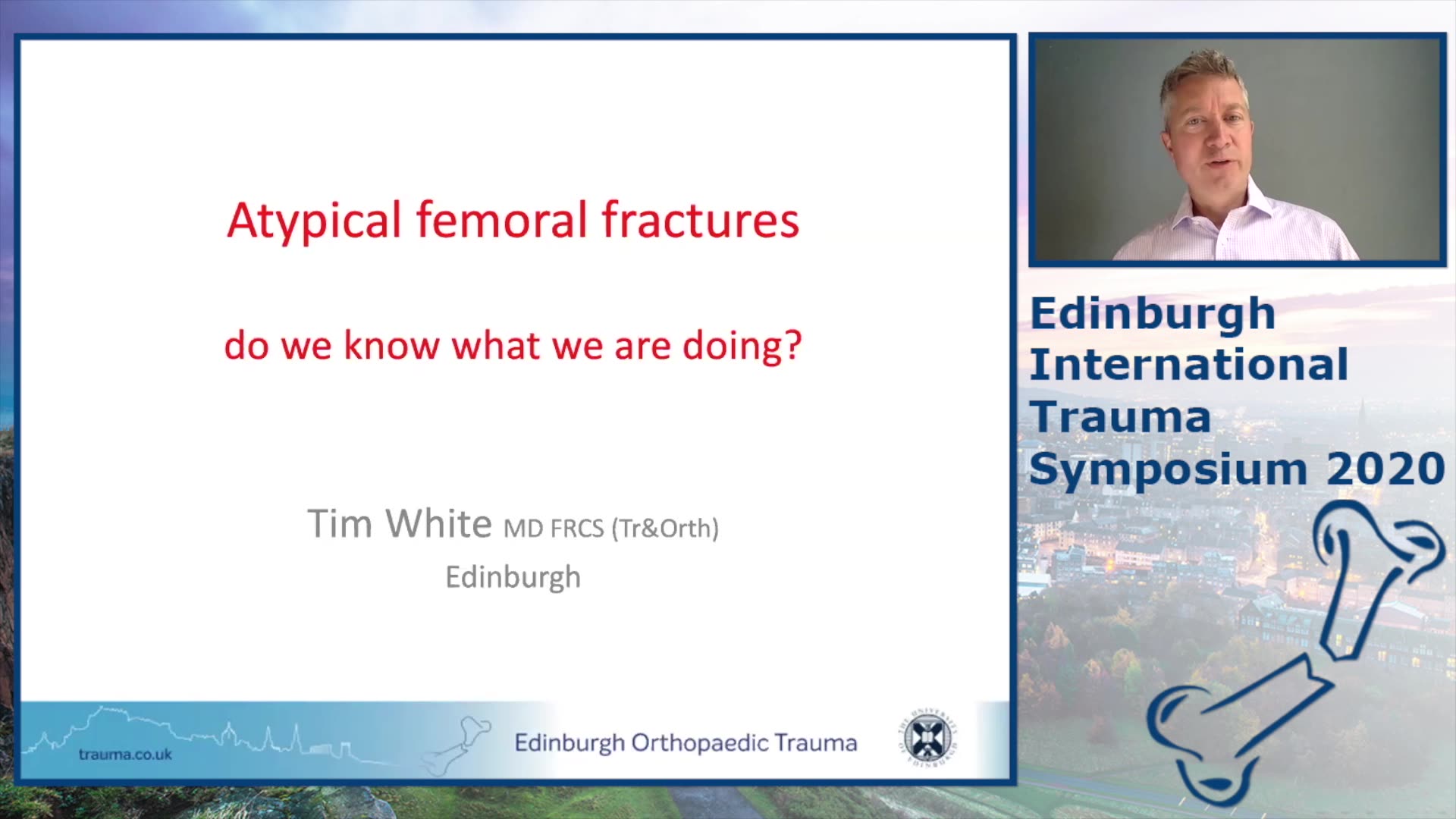 The presentation, led by Tim White, focuses on atypical femoral fractures, posing a challenging question: "Do we know what we are doing?" It highlights the uncertainties and complexities involved in treating these fractures. Atypical femoral fractures are rare, constituting only about 1% of all femoral fractures, and typically arise from minimal trauma, often preceded by discomfort in the hip or thigh. Their radiographic characteristics include a transverse element on the lateral cortex with signs of sclerosis and beaking, and they can appear bilaterally in 40% of patients. The talk further explores the connection between these fractures and long-term bisphosphonate use but clarifies that they can also occur in individuals who have never been administered these medications.