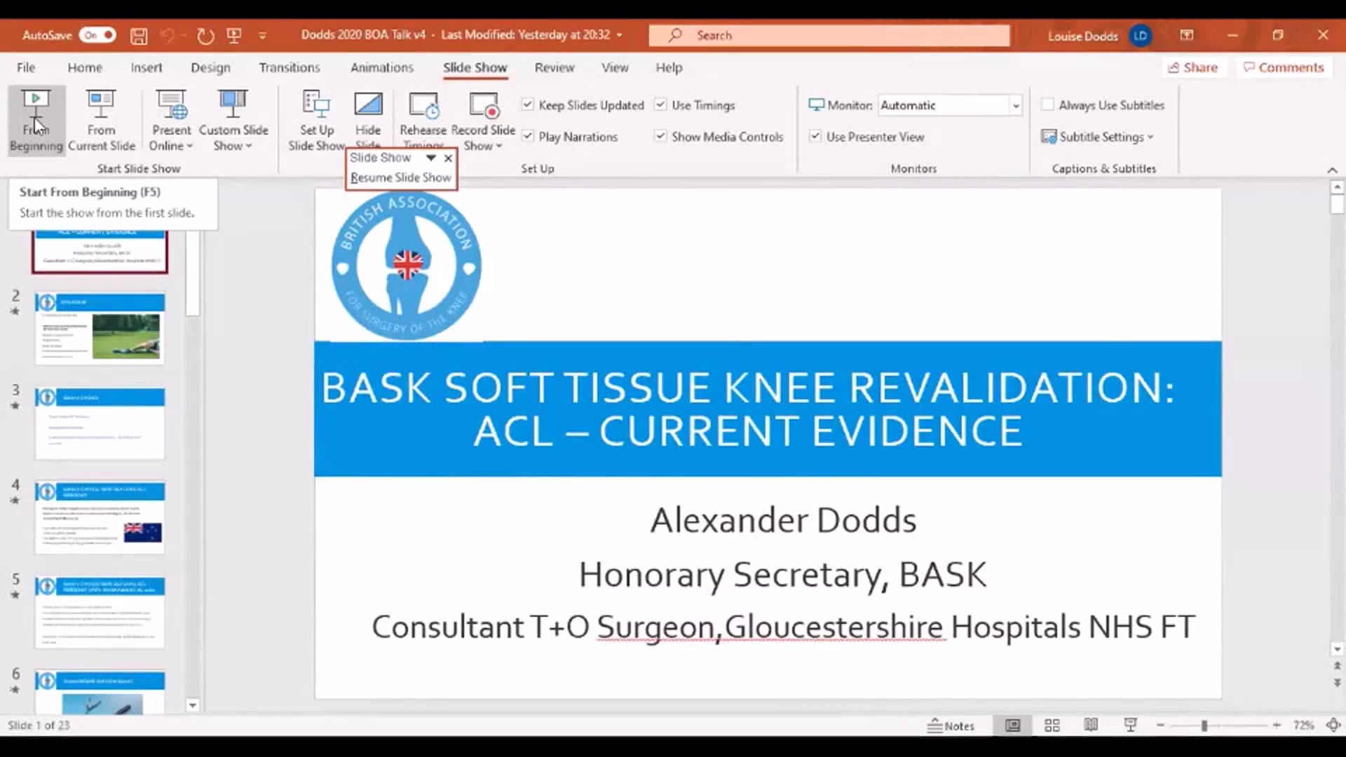 Alexander Dodds presents an update on current evidence regarding anterior cruciate ligament (ACL) injuries, focusing on significant findings from the past year. This session will review important studies that may influence the practice of knee surgeons, particularly concerning graft choices for primary ACL reconstruction and failure risks associated with various methods.