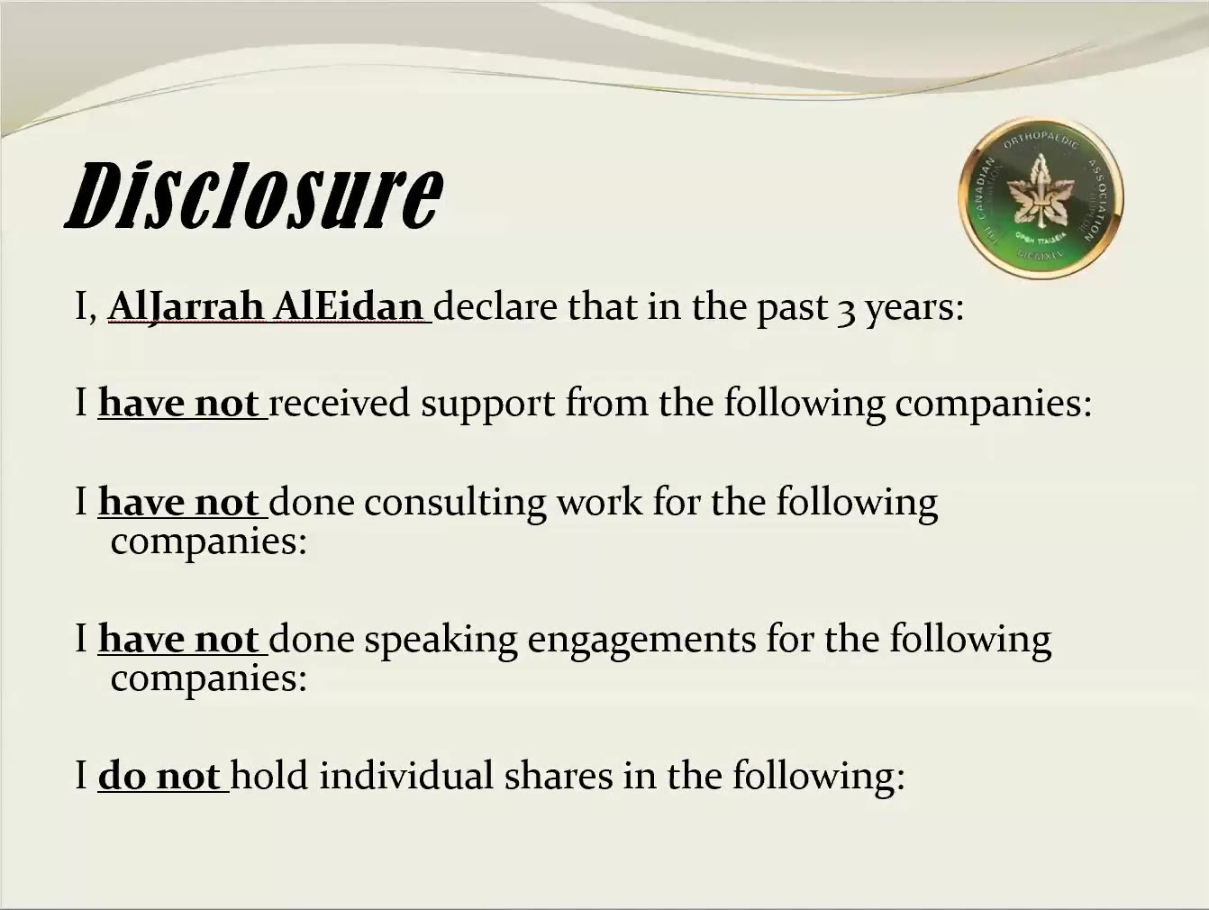 The presentation is delivered by AlJarrah AlEidan, who starts by declaring no conflicts of interest. The focus of the study is a biomechanical comparison of graft preparation techniques for use in digital radiology and joint reconstruction, specifically addressing distal radioulnar joint (DRUJ) instability, a common condition that leads to wrist pain following distal radius fractures. AlEidan outlines various treatment methods available, including tendon grafts and suture options, and discusses the objectives of their study, which involved creating a model to simulate DRUJ allograft reconstruction for mechanical testing.