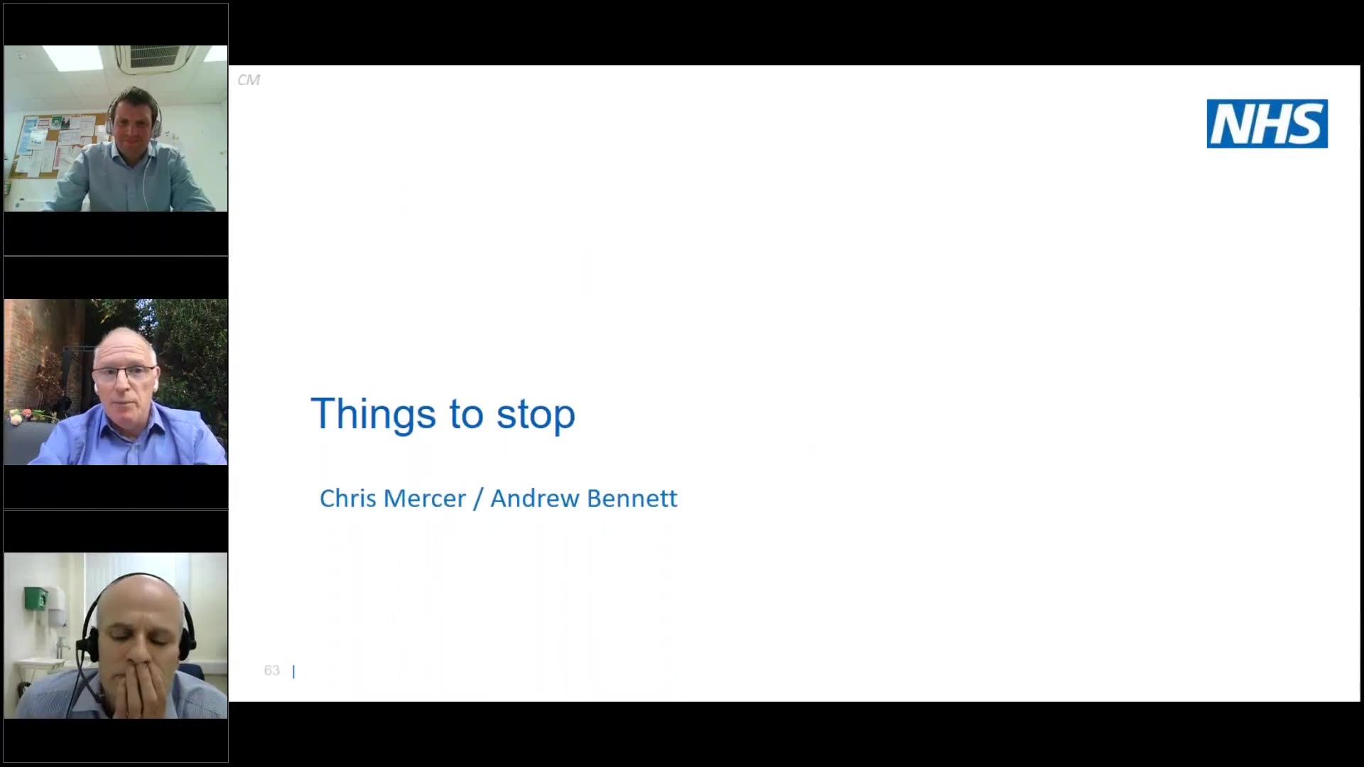 In this webinar excerpt, presenters Chris Moran and Andrew Bennett discuss the need to stop certain practices in their healthcare organization, reflecting on feedback from staff. Chris introduces Andrew, who highlights challenges faced, such as unclear communication due to technical difficulties. Andrew acknowledges the contributions of colleague Chris Mercer, emphasizing the need for collaboration and efficiency in a clinical environment.