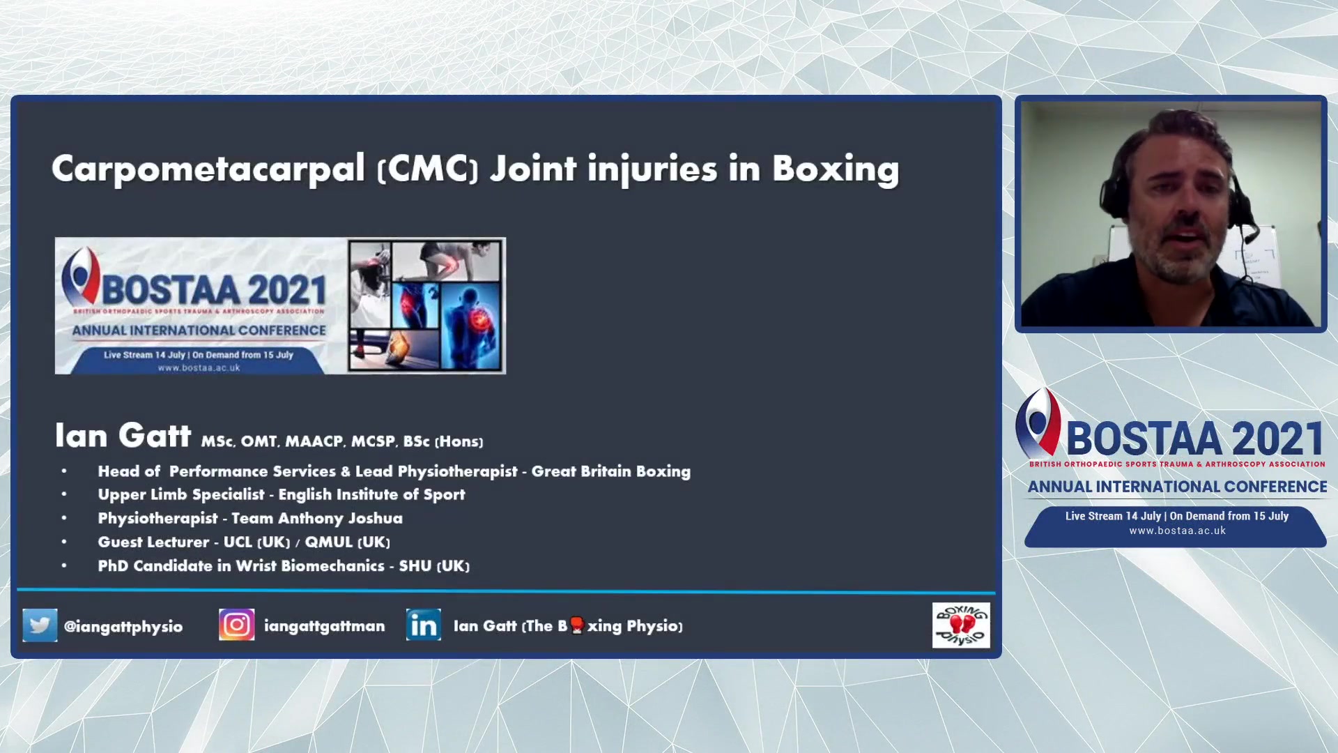 This video presentation features Ian Gatt, a physiotherapist with over 20 years of experience in sports, especially boxing. As the head of performance and lead physiotherapist for Great Britain Boxing, Gatt discusses carpometacarpal (CMC) joint injuries prevalent among boxers. He provides insights into the incidence of hand and wrist injuries in boxing, their common types, and the injury mechanisms involved, emphasizing the need for effective assessment and management strategies, both conservative and surgical.