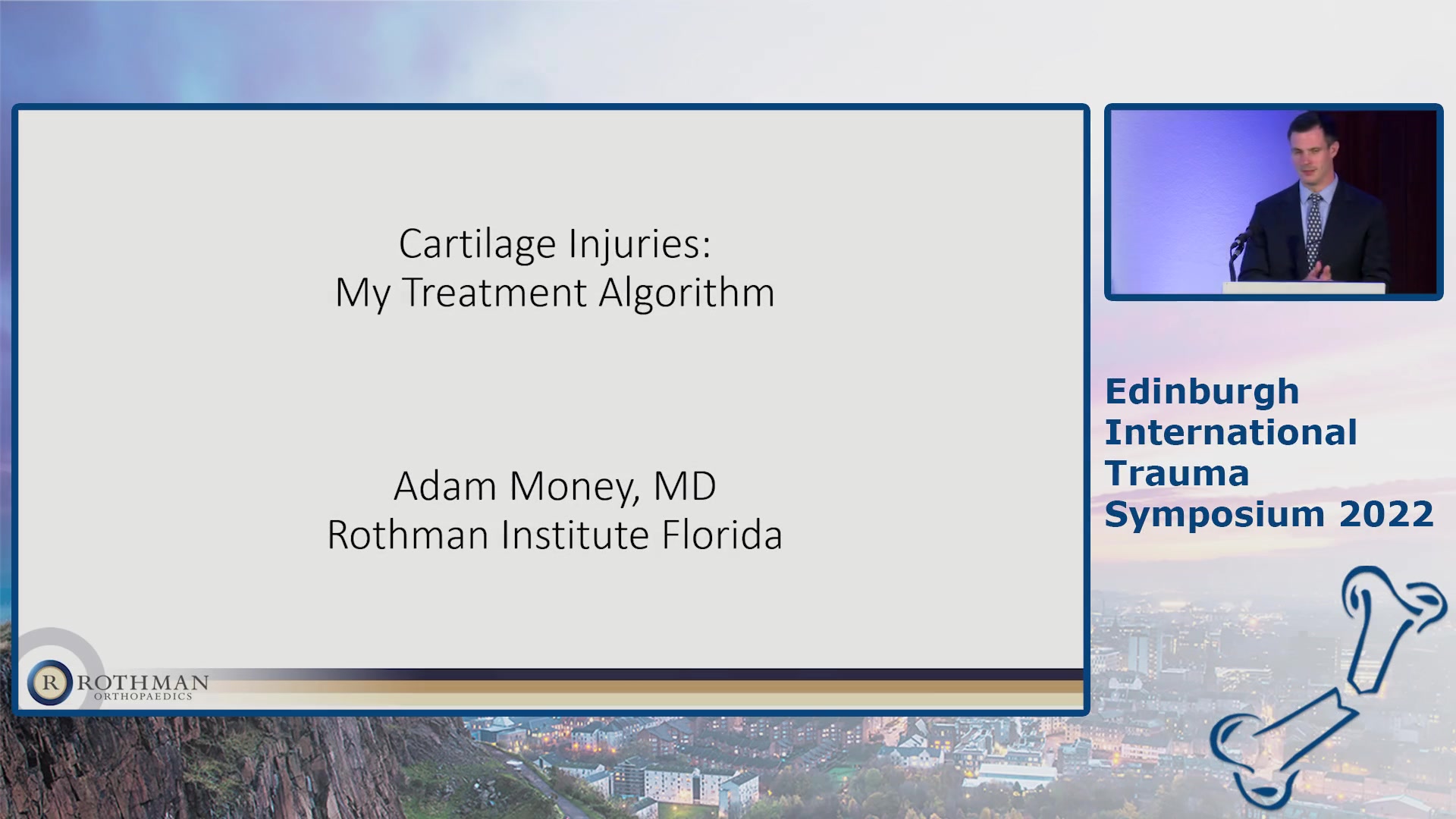 In this presentation, Dr. Adam Money expresses gratitude to the Edinburgh Orthopedic Association, complimenting the beauty of the city and its weather before diving into his treatment algorithm for cartilage injuries. He discusses the significance of fixing acute cartilage injuries, particularly emphasizing the importance of whether a lesion has a bony backing. Dr. Money shares a case example of a large cartilage piece repair using biocomposite screws, highlighting the need for various fixation techniques based on the injury's specifics.