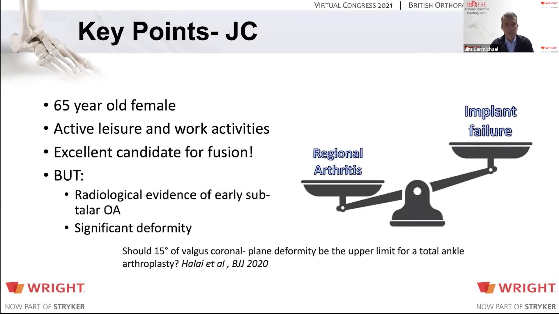 In this detailed discussion presented by Jim Carmichael, the medical intricacies surrounding surgical options for a 65-year-old woman facing ankle issues are elaborated. The case revolves around offering either an ankle fusion or an ankle replacement, both of which carry distinct risks and potential complications. Carmichael highlights the patient's fitness level and the emerging early evidence of subtalar osteoarthritis, which complicates the decision-making process regarding the appropriate procedure.
