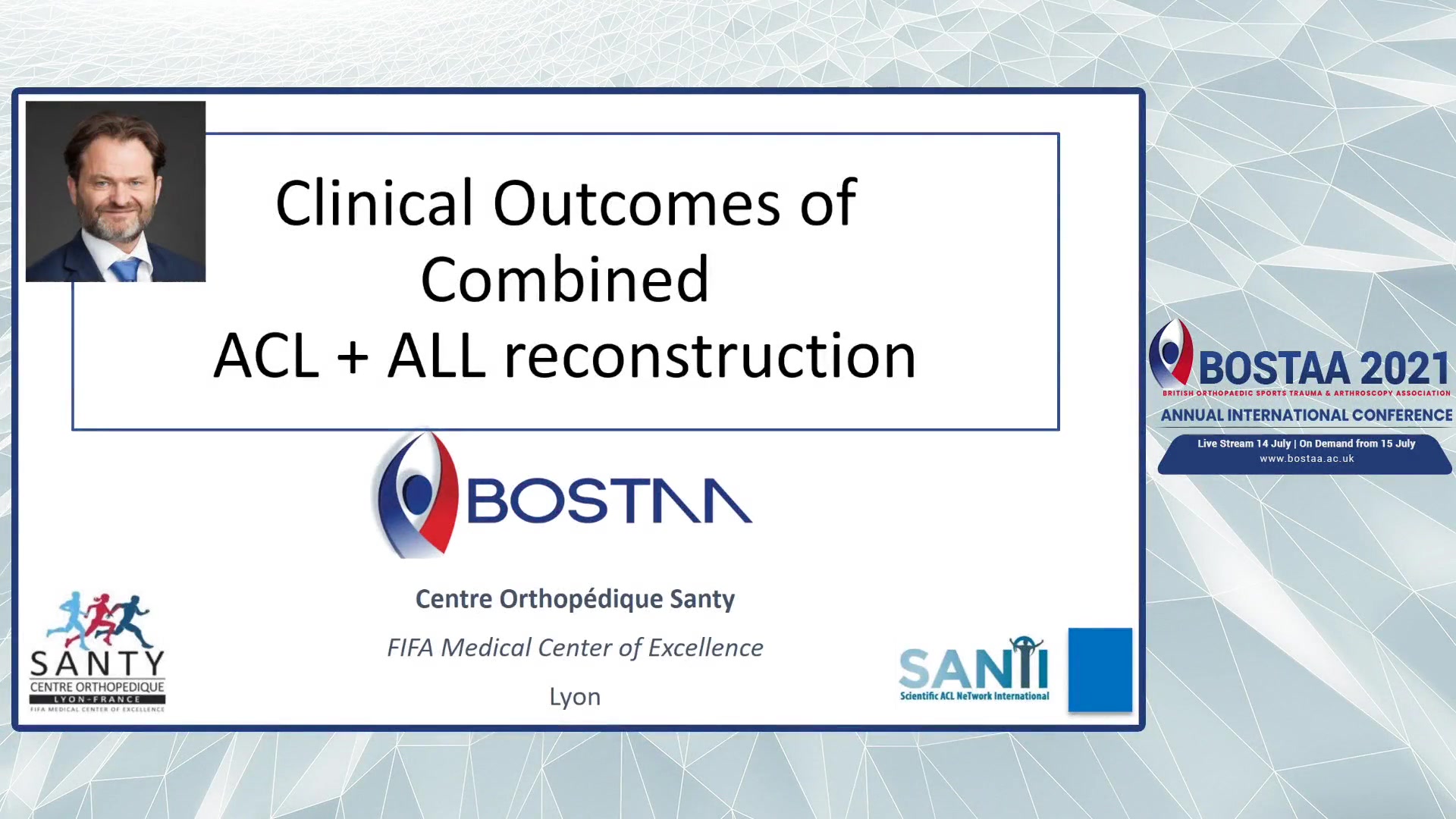 In this presentation, Bertrand Cottet-Sonnery discusses the clinical outcomes of combined ACL (anterior cruciate ligament) and ALL (anterolateral ligament) reconstruction. He expresses his gratitude for the opportunity to speak and introduces the topic with a commentary highlighting the shift in focus towards not only considering if augmentation is necessary but also addressing the methods of augmentation to enhance surgical outcomes. Cottet-Sonnery reviews the complex nature of ACL injuries that often accompany additional concomitant lesions, notably the importance of addressing injuries to both the anterolateral and posteromedial aspects of the knee.