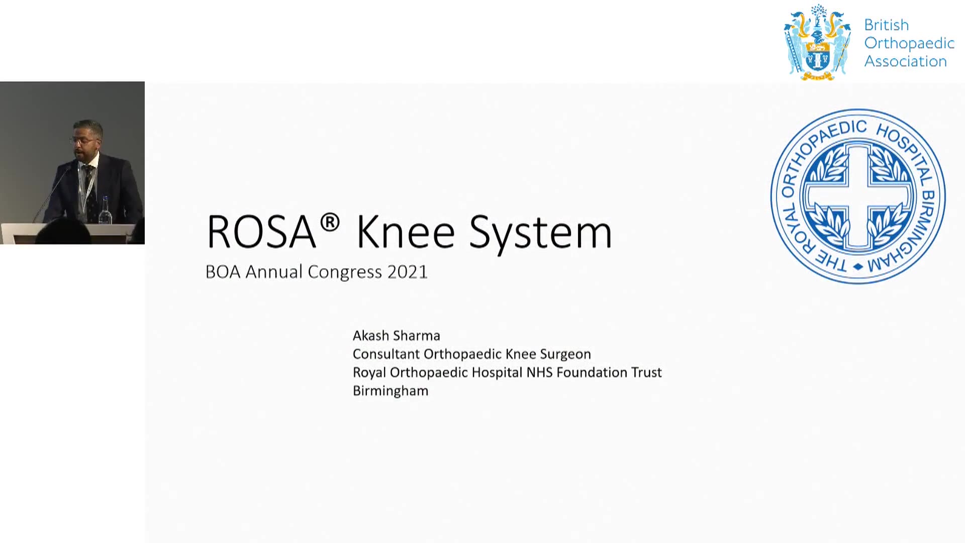 In this presentation, consultant knee surgeon Akash Sharma from Birmingham discusses his journey and experience with ROSA, a robotic surgical system, in the field of knee arthroplasty. He opens with a warm greeting and acknowledges Dinesh for the invitation to speak. Sharma reflects on the growth of his hospital in Northfield, where they perform around 1,200 elective total knee replacements annually, with plans to increase capacity.