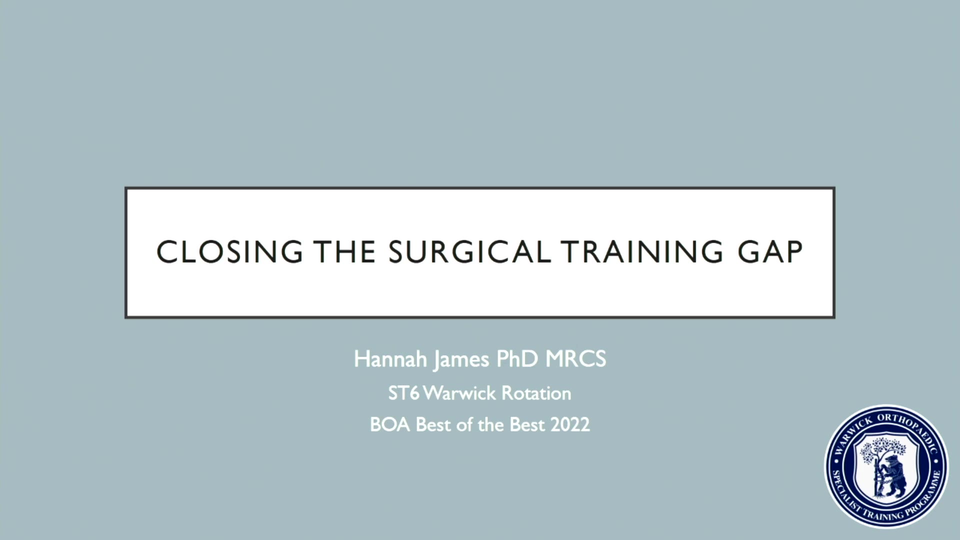 In this presentation, Hannah James, an ST6 trainee on the Warwick rotation, addresses the significant surgical training gap exacerbated by the COVID-19 pandemic. She details data illustrating how the pandemic has resulted in an average loss of 375 surgical cases per trainee, effectively equating to a full training year. Despite entering a recovery phase, the surgical training rates are still below baseline, highlighting the urgency to address this issue.