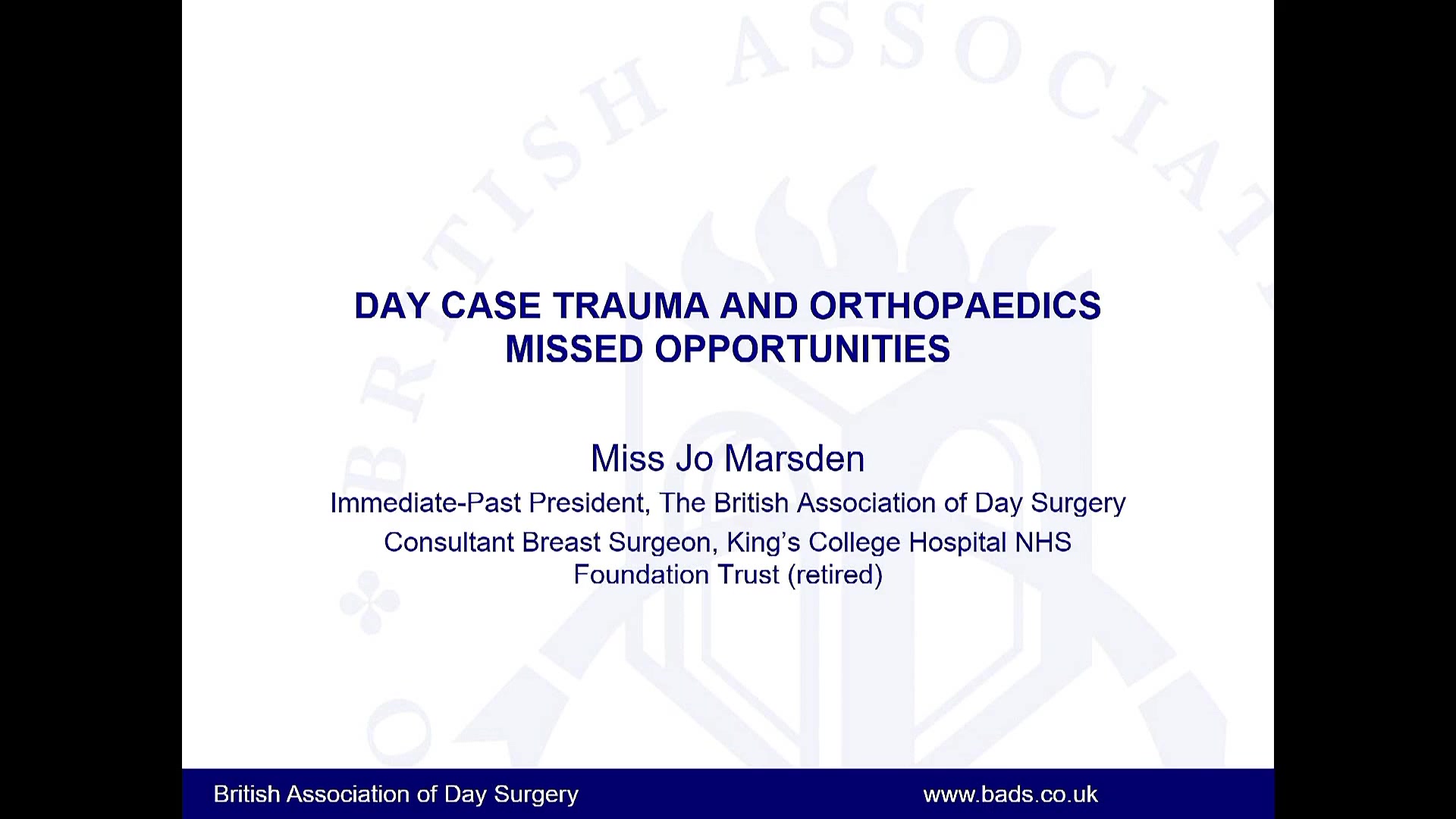 This session led by Jo Marsden focuses on the topic of day surgery in trauma and orthopaedics, emphasizing the importance of addressing missed opportunities in this area. Jo introduces the British Association of Day Surgery (BADS), the only UK organization dedicated to enhancing day surgery practices, which consists of a multidisciplinary group including surgeons, anaesthetists, nurses, allied health professionals, and managers. Jo highlights the strategic objectives of BADS, such as improving understanding and sharing excellence in day surgery, along with the educational initiatives they pursue.