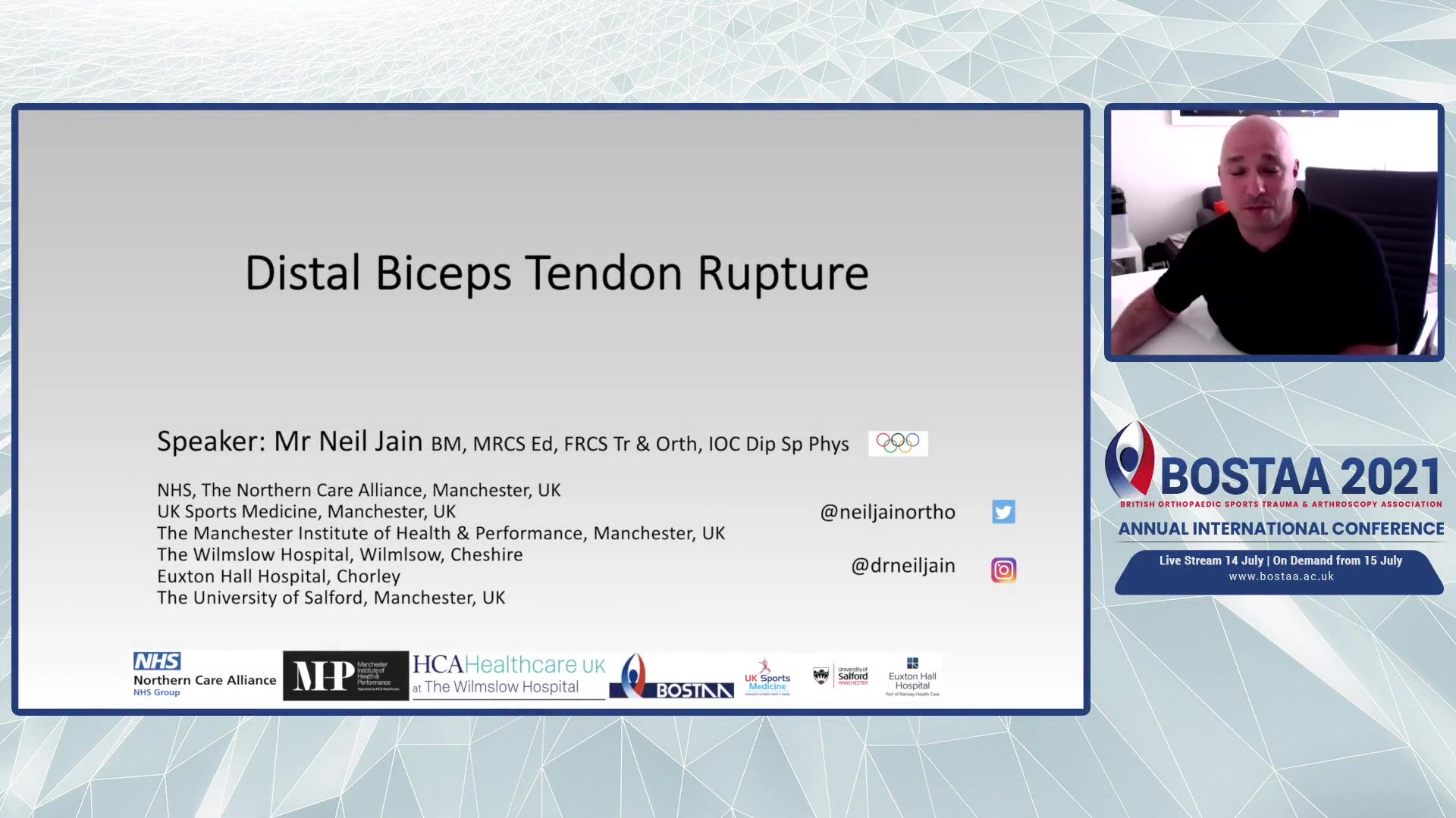 This presentation by Neil Jain focuses on distal biceps tendon ruptures, discussing key topics such as the mechanism of injury, historical treatment approaches in the UK, and modern treatment options. Neil introduces himself as a speaker from Manchester, UK, and expresses gratitude to attendees for their participation, emphasizing the importance of joining the BOSTAA organization for further educational opportunities.