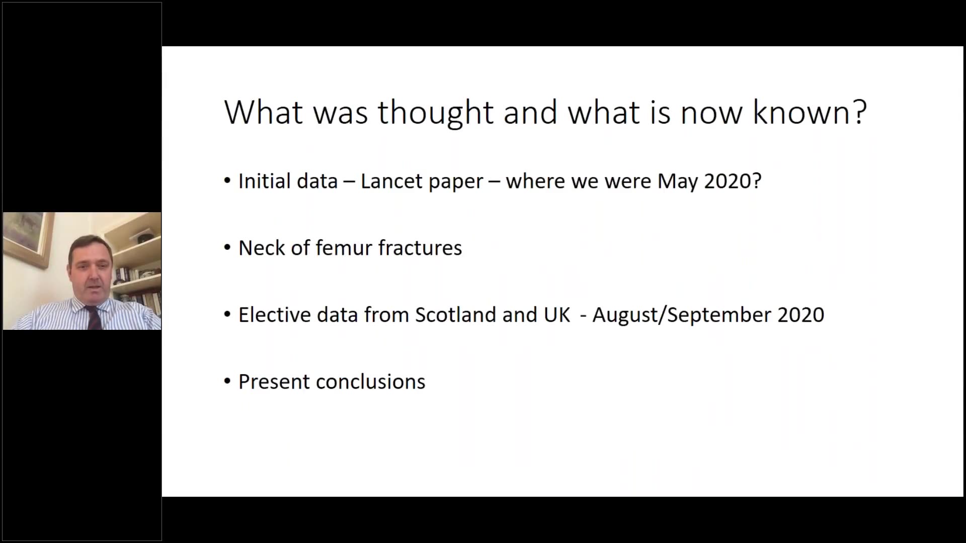 This VTT transcript captures a presentation by Dominic Meek on the effects of COVID-19 on elective orthopedic surgeries and trauma cases, particularly focusing on neck of femur fractures. The presentation is structured in segments, where the speaker discusses data from initial studies, specifically referencing a seminal Lancet paper that reported a reduction in elective operations during the pandemic. Meek highlights the stark 95% decrease in elective orthopedic surgeries at his institution and the implications for waiting lists, particularly emphasizing the failed standard processes during the lockdowns.