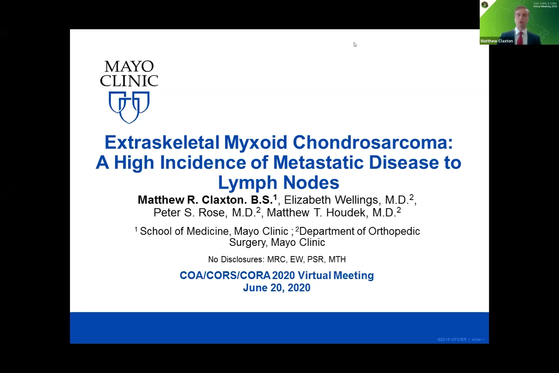 In this presentation, Matthew Claxton discusses a retrospective study focused on extraskeletal myxoid chondrosarcoma (ESMC), a rare subtype of soft tissue sarcoma. The research aims to assess the incidence of lymph node metastasis in ESMC patients and its implications for treatment outcomes. Claxton begins by expressing gratitude for the opportunity to present and acknowledges his co-authors.