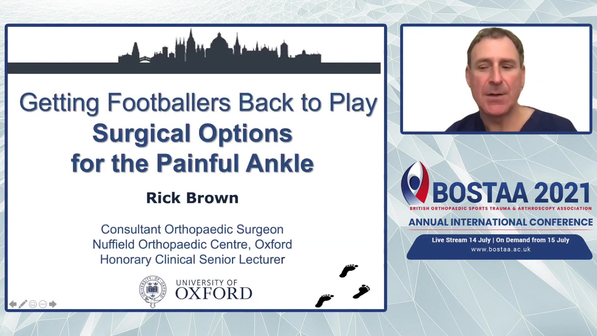 In this presentation at the BOSTAA Conference, Dr. Rick Brown, a consultant orthopedic surgeon at the Nuffield Orthopedic Centre in Oxford, discusses surgical options for managing painful ankles in footballers to facilitate their return to play. Dr. Brown begins by expressing gratitude to the organizing team and highlights his experience with local football teams in both Oxford and Gloucestershire.
