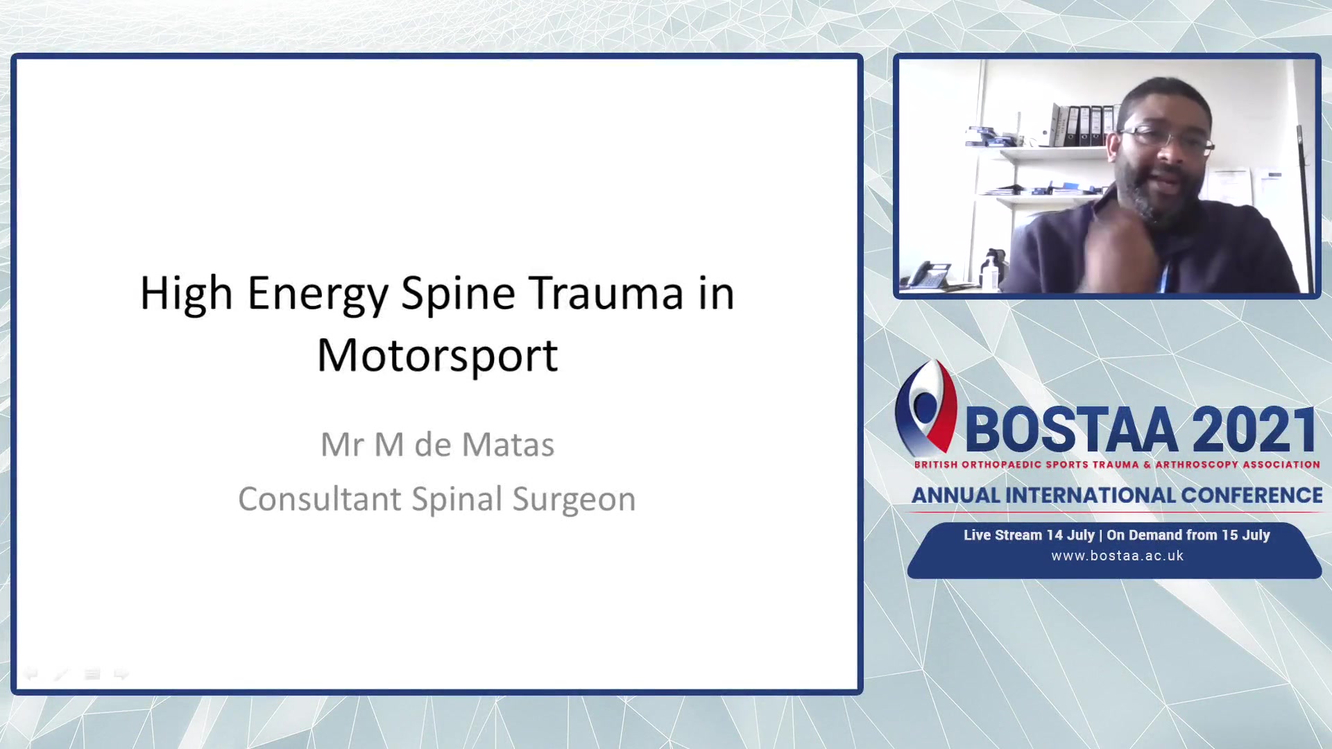 In this detailed presentation, Consultant Spinal Surgeon, Marcus de Matas, discusses the serious topic of high-energy spinal trauma related to motorsport activities. He introduces himself and outlines his extensive experience treating injuries, particularly those sustained by motorcycle racers in high-stakes events such as the Isle of Man TT and the Manx Grand Prix, as well as injuries from prominent racing circuits like Aintree. Throughout the talk, he references a key text by sports journalist Rick Broadbent, highlighting various motorcyclist injuries documented in the past.