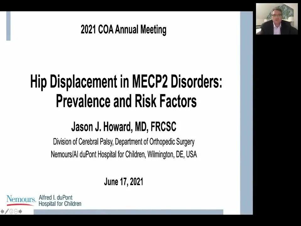 In this presentation, Jason Howard discusses a study on hip displacement in MECP2 disorders, such as Rett syndrome and duplication syndrome, which are characterized by developmental challenges and autism-like features. The research highlights that hip displacement, while under-studied compared to scoliosis in these populations, has a prevalence of 36% among patients, with significant risk factors including non-walker status, clinically relevant scoliosis, and refractory epilepsy. Howard describes the methodology of the study, which was a retrospective case control design involving 56 patients with confirmed genetic diagnoses, and emphasizes the need for hip surveillance programs to aid early detection of hip issues before they lead to painful arthritis. The results suggest annual monitoring starting at age four, with recommendations for further multi-institutional studies to refine surveillance strategies.
