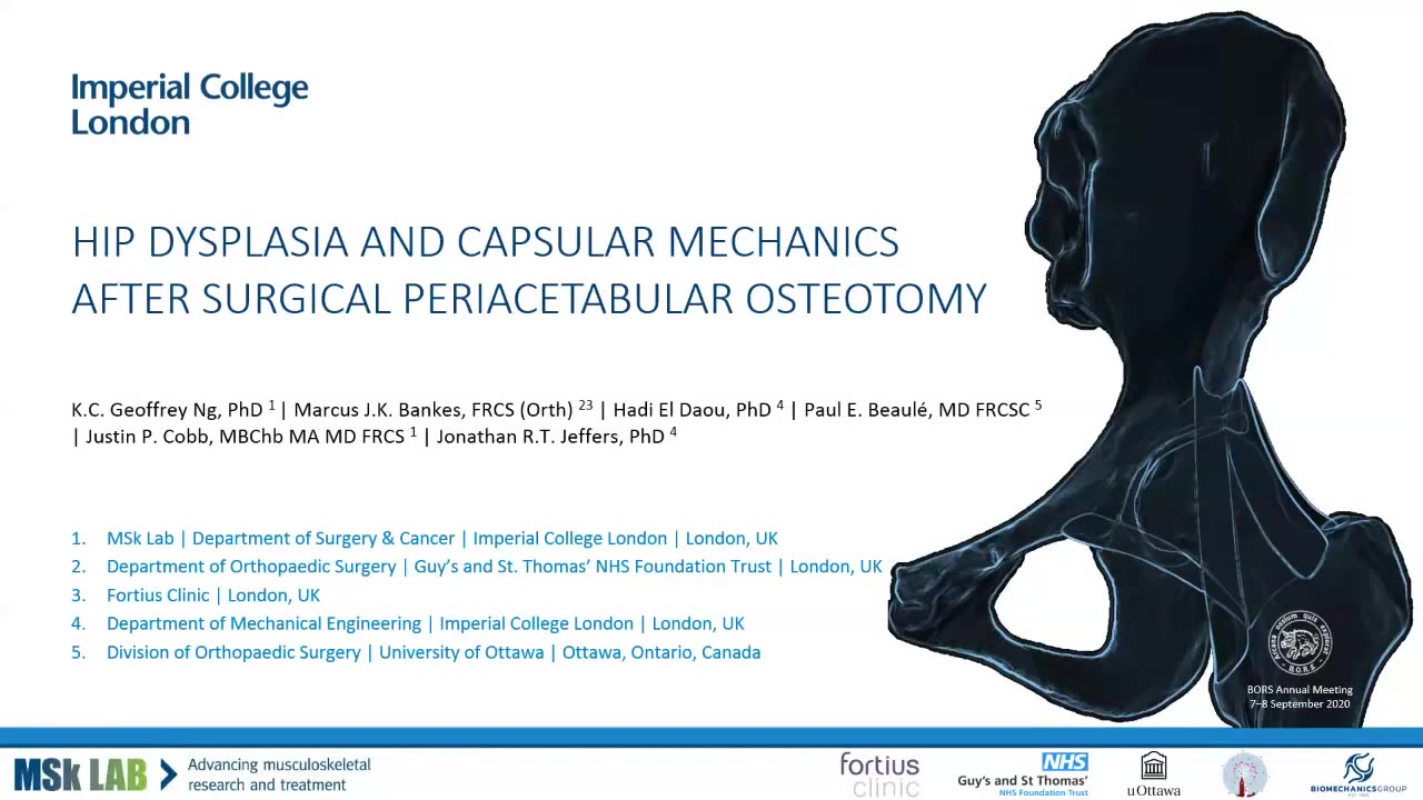The presentation concludes by emphasizing the need for understanding capsular contributions in optimizing surgical outcomes for patients with hip dysplasia. Geoffrey acknowledges his coauthors and funding contributions, providing a comprehensive overview of the interplay between surgical techniques and joint dynamics.