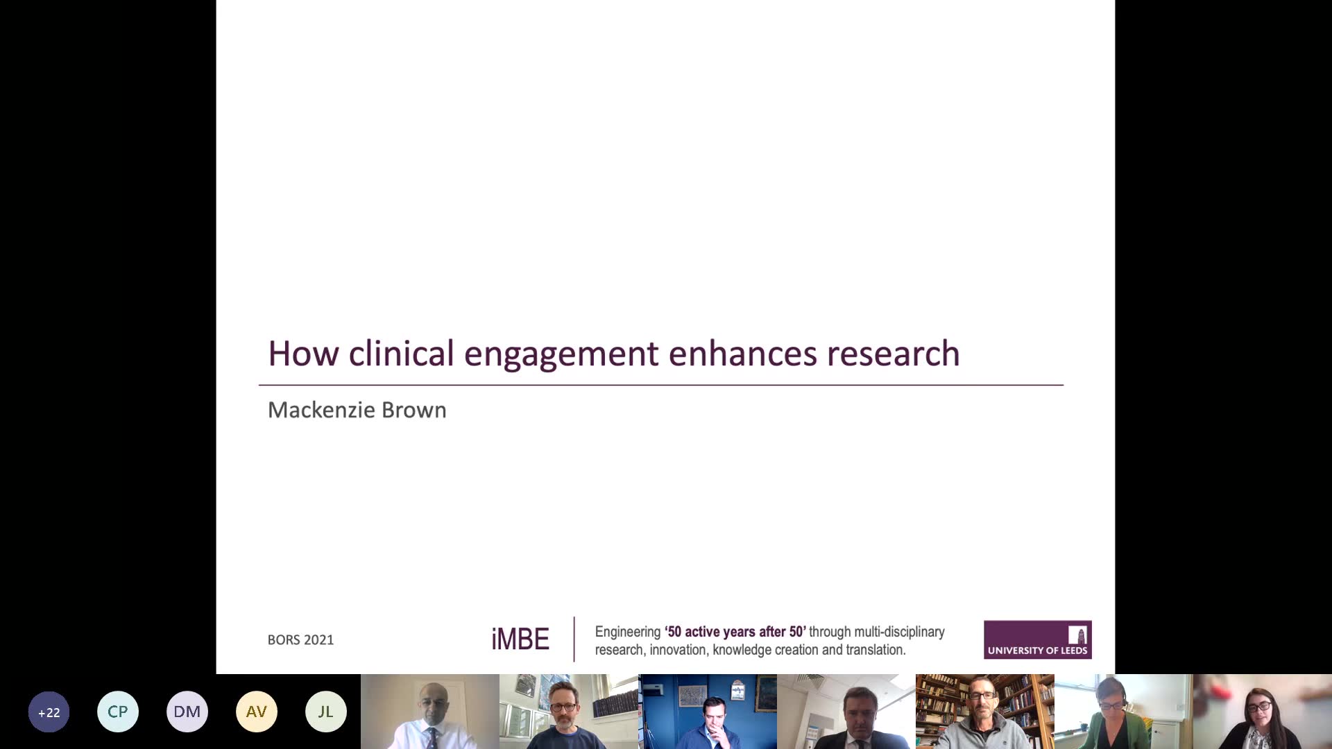 Mackenzie Brown, currently a PhD candidate at the University of Leeds, presents insights on the significance of clinical engagement in enhancing research, particularly in the field of tissue engineering and regenerative medicine. With a background in mechanical engineering from the University of Southampton, Mackenzie focuses on dual mobility hip replacements and is involved in managing a retrievals laboratory for implant analysis. She outlines how clinical input, access to key resources, and unique learning opportunities shape a more informed research environment.