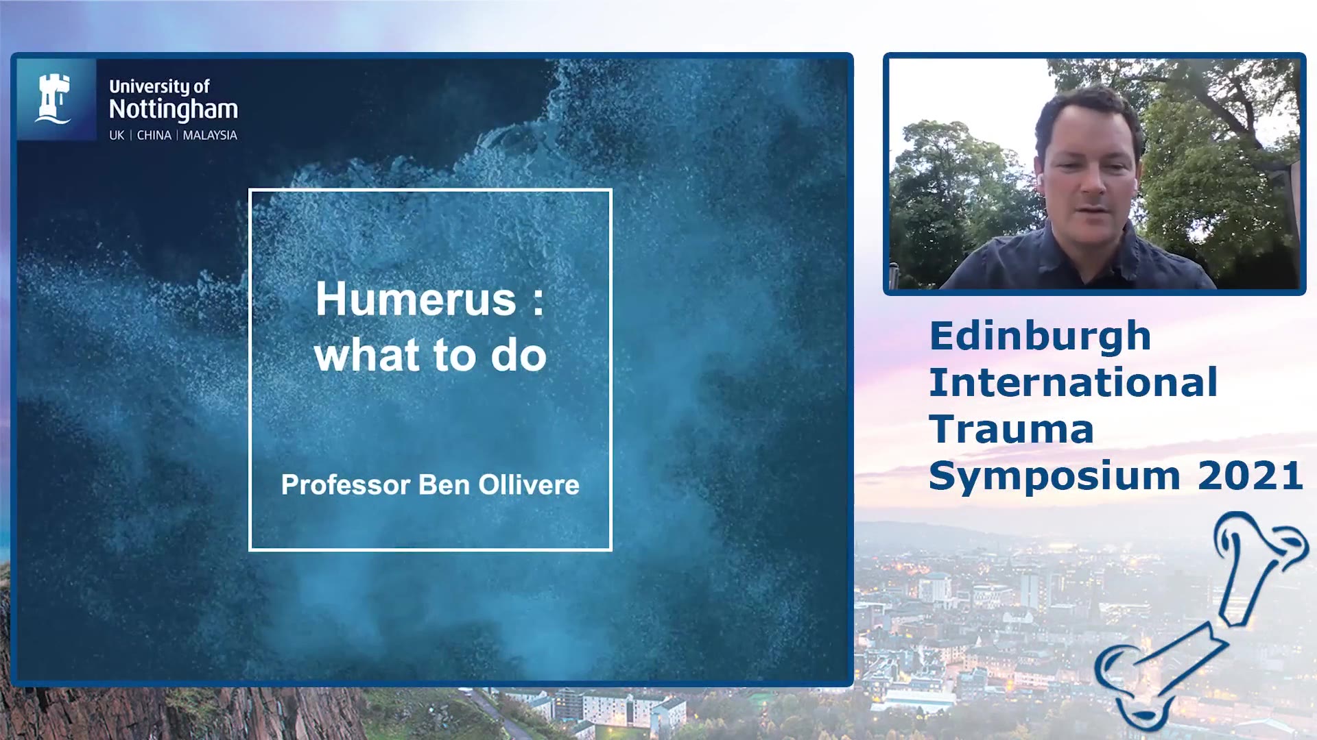 The video lecture is presented by Ben Ollivere, a Professor of Orthopedic Trauma from Nottingham. The primary focus of the talk is on the treatment of humeral shaft fractures, specifically comparing the use of plates versus braces for managing these injuries. Ollivere begins with a brief introduction and thanks the organizing team, before emphasizing that the treatment approach is not straightforward. He discusses the circumstances under which different treatment options are warranted, citing examples of complete shoulder girdle injuries that would require surgical fixation versus cases where non-operative treatment with a brace might suffice.