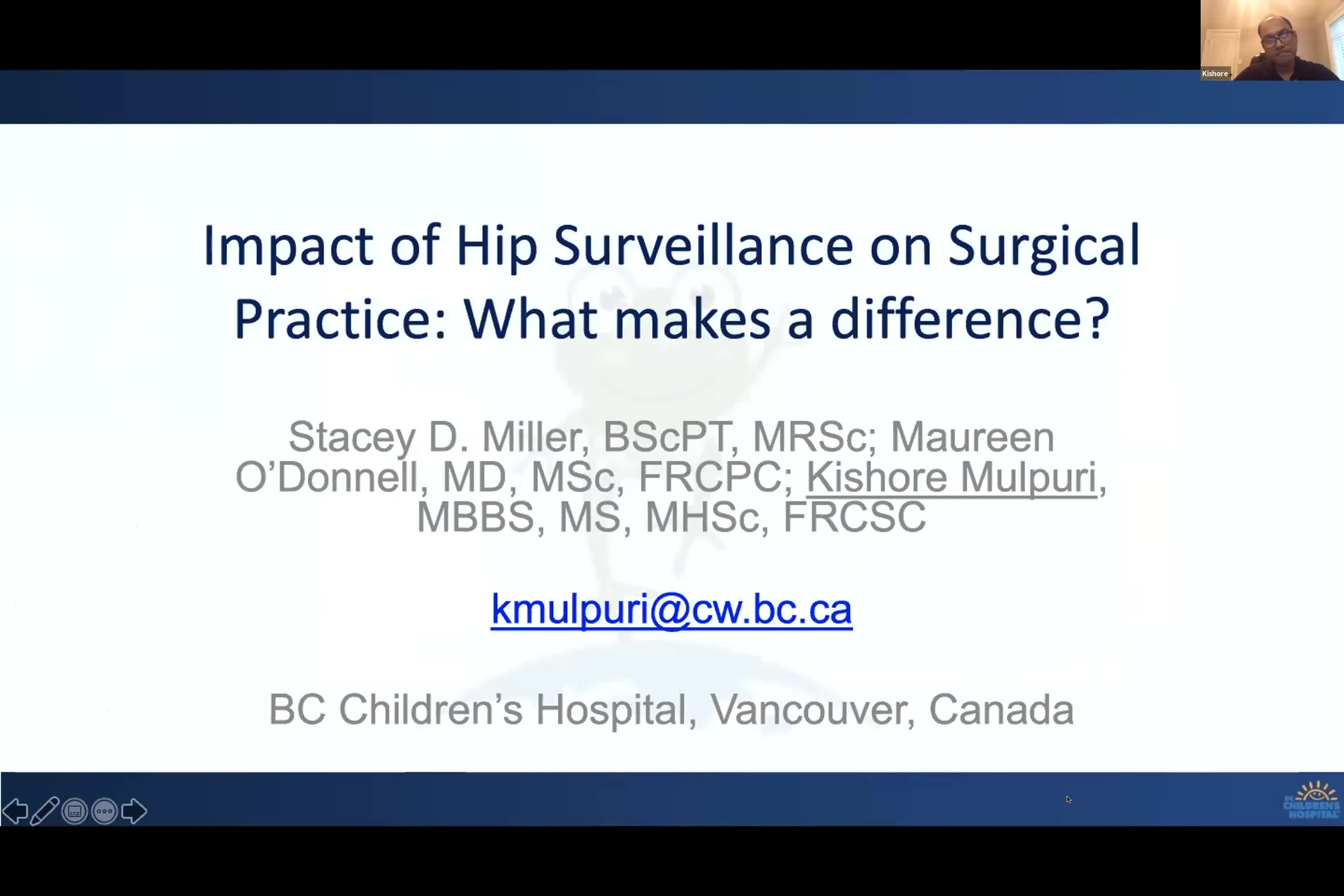 The presentation begins with Kishore Mulpuri acknowledging his co-author, Stacy Miller, and providing an overview of their research regarding hip surveillance in children. He emphasizes the importance of early detection of hip displacement to prevent dislocation and subsequent pain. Mulpuri outlines the timeline of their study, which is divided into three periods: pre-2010, a period of advocacy from 2010 to 2015, and post-implementation of the hip surveillance program starting in 2015. He highlights how advocacy efforts and discussions led to the successful rollout of the program. The study evaluates the impact of this implementation on surgical outcomes, showing a marked improvement in reducing the need for salvage surgery due to better preventative measures and knowledge translation efforts. Mulpuri urges professionals to actively engage in discussions about hip surveillance programs instead of waiting for formal approval from provincial authorities to enhance patient outcomes.
