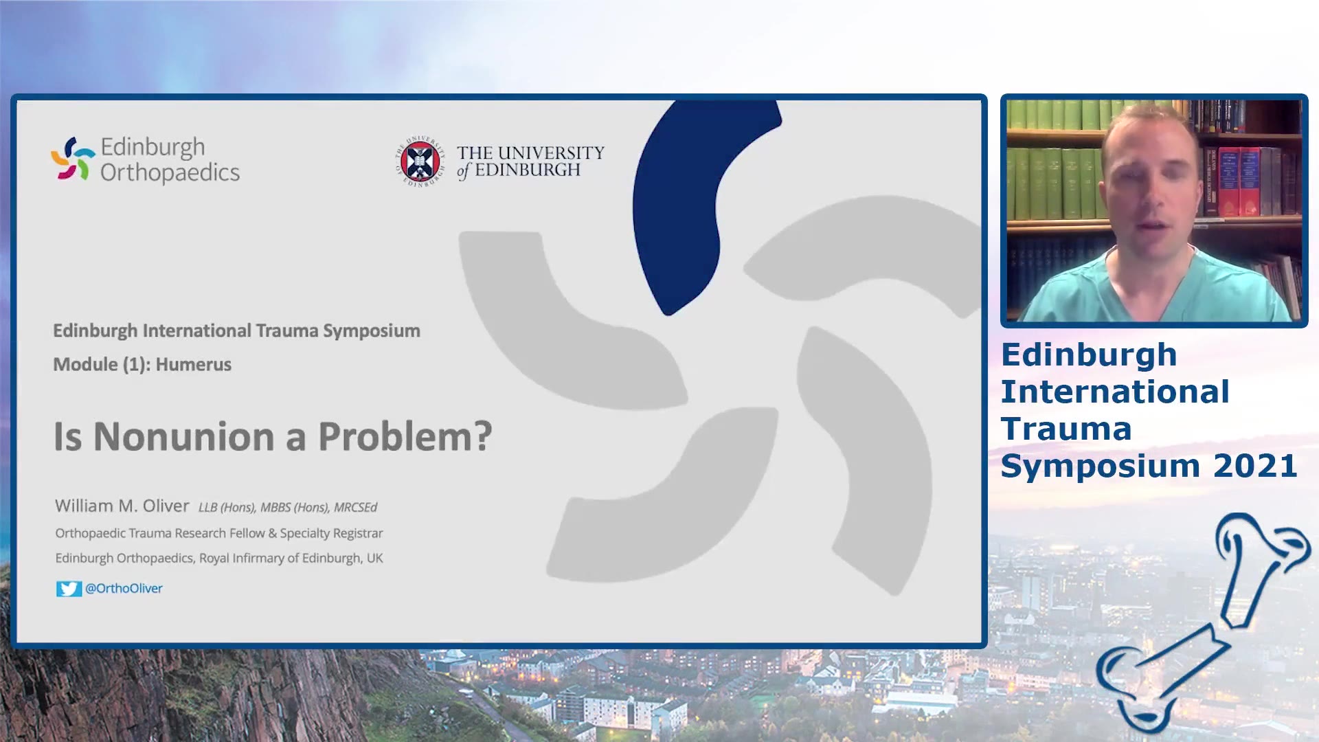 In this presentation delivered by William Oliver, a Research Fellow and Specialty Registrar at Edinburgh Orthopedics, attendees are welcomed to the Orthopedic Library at the Royal Infirmary of Edinburgh. The focus is on the critical topic of Humeral Shaft Nonunion, specifically addressing whether nonunion is a significant problem in the context of orthopedic treatment. William discusses the default practice of non-operative management for isolated closed humeral shaft fractures, despite alarming statistics showing nonunion rates can range between 20% to 30% following such treatments.