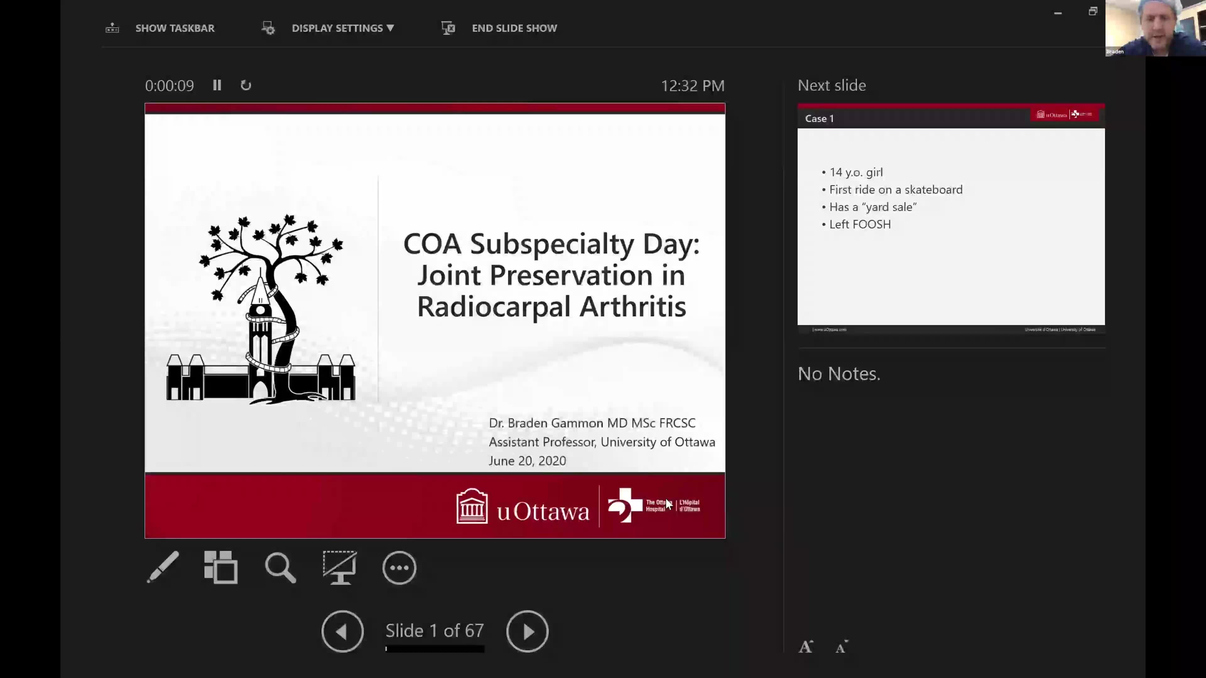 This presentation, led by Braden Gammon, revolves around the topic of joint preservation in the context of radiocarpal arthritis. The talk specifically focuses on the clinical case of a 14-year-old girl who suffered a skateboard accident resulting in a significant wrist injury, leading to a displaced fracture of both the distal radius and ulna. Over time, her condition reveals complications such as increased ulnar variance and eventual premature growth plate closure at the distal radius.