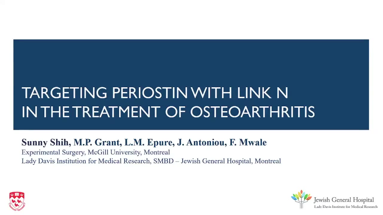 In this presentation, Sunny Shih, a master's student in Dr. Antoniou and Dr. Mwale's lab, discusses her thesis focused on targeting periostin in the treatment of osteoarthritis (OA). Sunny opens by highlighting the debilitating nature of OA, which is characterized by cartilage degradation and a substantial societal and economic burden, currently lacking effective medical treatments. She introduces periostin, a secreted protein associated with tissue repair and disease, and explains her findings of elevated periostin levels in human OA chondrocytes. Sunny elaborates on how increased periostin promotes destructive pathways in cartilage, while her lab's work with a peptide called Link N shows promise in suppressing these harmful effects. Through experiments in rabbit and canine models, as well as human chondrocytes, she demonstrates that Link N reduces periostin expression, suggesting its potential as a therapeutic target for OA. Sunny concludes by acknowledging her mentors and collaborators, emphasizing the significance of Link N in understanding and combating degenerative joint diseases.