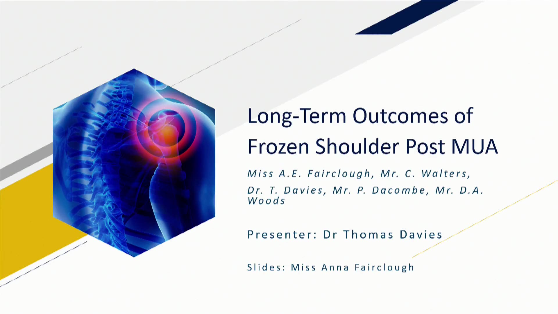 Thomas Davies presents a study on the long-term outcomes of frozen shoulder treatment with manipulation under anesthetic (MUA) at Aintree Hospital, Liverpool. He discusses the lack of research on 10-year outcomes and the role of diabetes in disease severity. The study surveyed 398 shoulders treated from 1999 to 2010, with 240 datasets analyzed, showing sustained improvement in the Oxford Shoulder Score. Recurrence rates of frozen shoulder post-MUA were low, even among diabetic patients, suggesting true recurrence is rare. The study did not find an increased incidence of other shoulder pathologies linked to MUA, demonstrating its long-term safety and effectiveness. Audience questions focused on recurrence categorization and treatment alternatives, with Davies confirming that prior results reflect a need for careful interpretation of post-operative outcomes. The session concludes with commendations for the presentation.