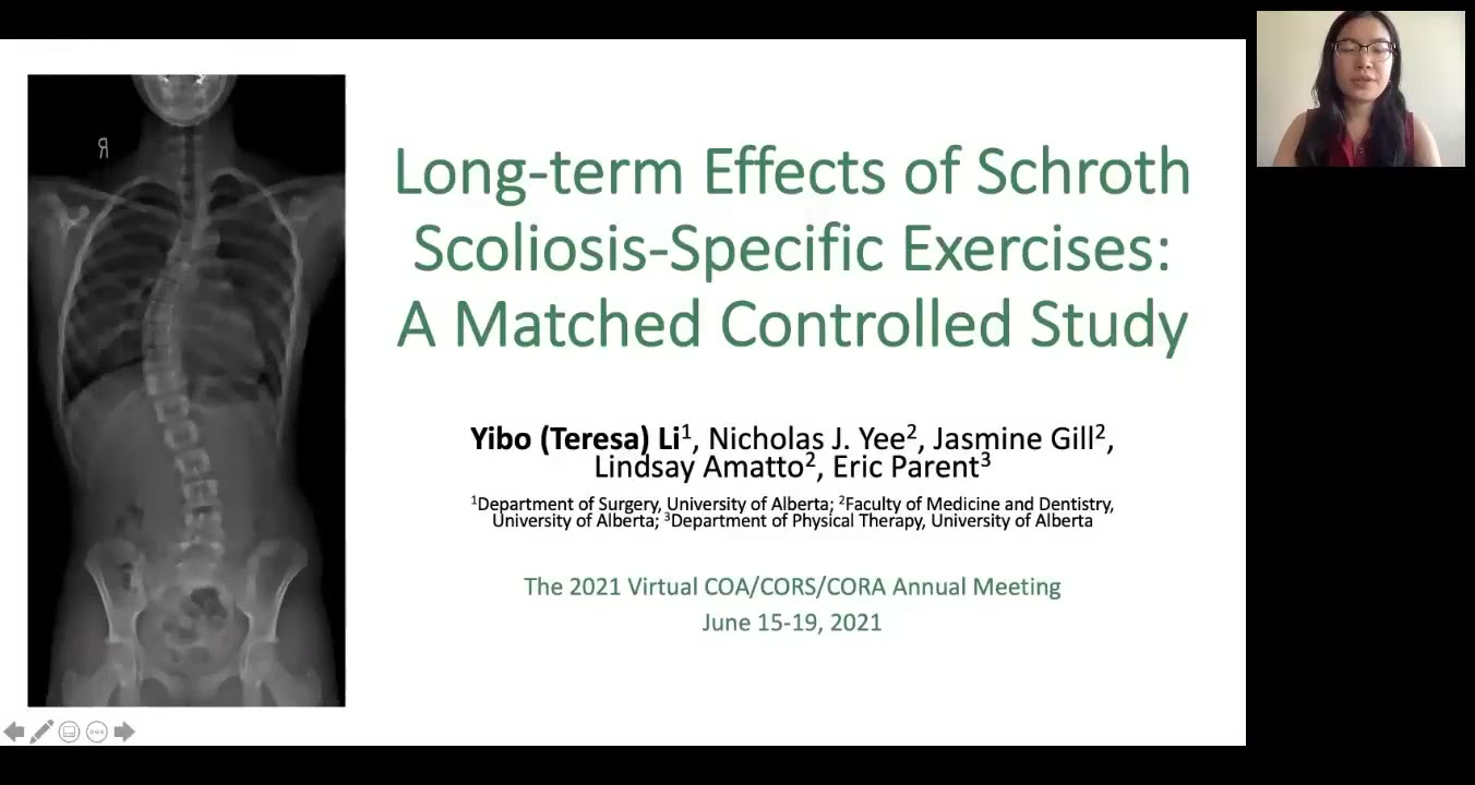 In this presentation, Teresa Li, a third-year orthodontic resident at the University of Alberta, discusses her research project titled "Long-term Effects of Stress Scoliosis-Specific Exercises." She introduces the issue of adolescent idiopathic scoliosis (AIS), a common condition characterized by a three-dimensional deformity of the spine, which can lead to severe health and psychosocial problems.