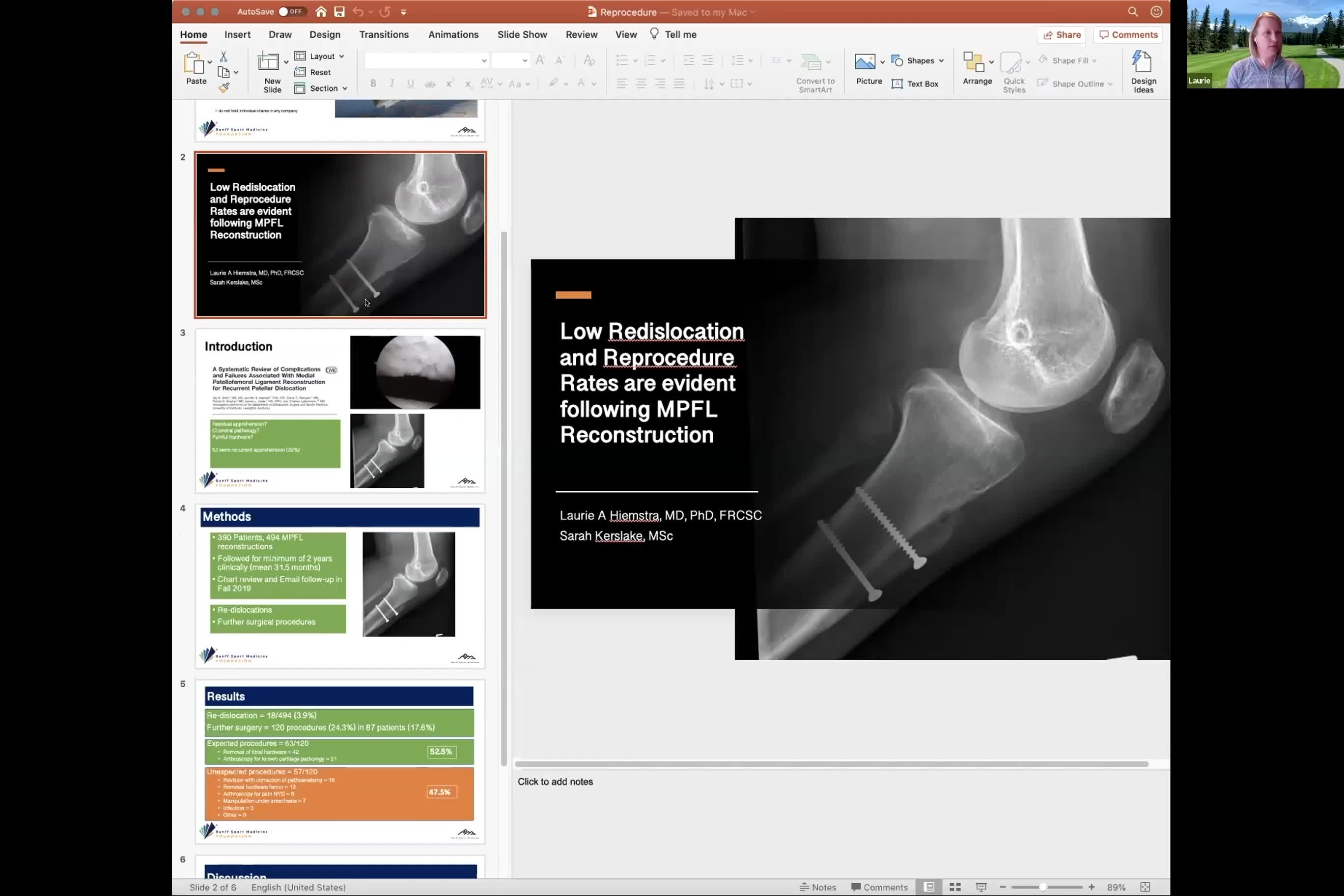 This transcript captures a presentation by Laurie Hiemstra discussing the complexities of MPFL (medial patellofemoral ligament) reconstruction for patellofemoral instability. Hiemstra begins by outlining her disclosures related to the research conducted at Banff Sport Medicine Centre in Alberta, emphasizing the increasing frequency of this procedure over the last decade, while acknowledging difficulties in decision-making for stabilizing the patella. She highlights a 2012 systematic review reporting a 26% complication rate which may contribute to surgeon apprehension about these surgeries. Hiemstra delves into what constitutes a surgical complication and the ongoing challenges faced by patients post-surgery, such as apprehension and significant chondral lesions from prior dislocations, noting that typical perceived complications might be expected outcomes rather than actual surgical failures.