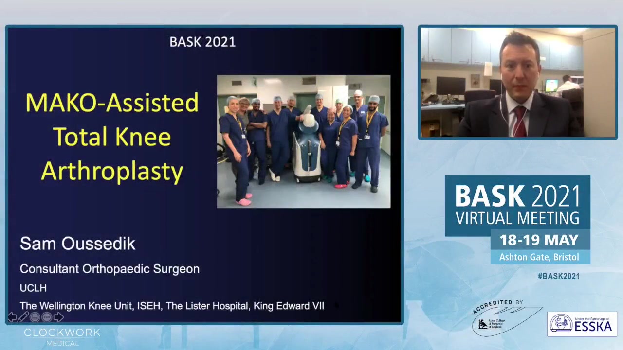 The transcript details a presentation by Sam Oussedik, a consultant orthopedic surgeon in London, on MAKO-Assisted Total Knee Arthroplasty. He discusses the challenges and successes of total knee replacement surgery, including the low revision rates and ongoing patient dissatisfaction due to issues such as post-operative pain and stiffness. Oussedik advocates for robotic-assisted techniques to reduce surgical trauma and improve patient outcomes. He highlights how advanced surgical techniques, including precise alignment and minimized soft tissue damage, lead to greater patient satisfaction. Throughout the talk, he addresses important concepts like mechanical alignment versus kinematic alignment, providing insights into optimizing surgical techniques to enhance recovery and long-term results for patients undergoing knee arthroplasties.