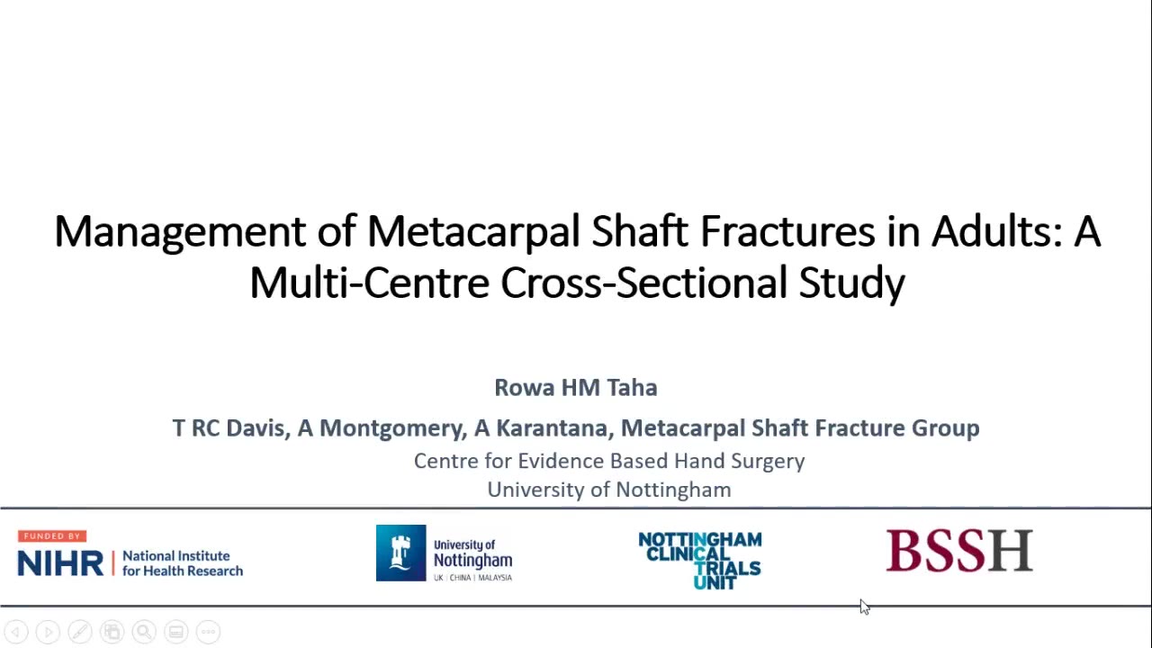 The presentation discusses a multicenter study conducted on the management of metacarpal shaft fractures in adult patients. The study aimed to describe the epidemiology of these injuries, assess variations in medical practices and complications, and document resource usage. The research reviewed healthcare records from six centers across the UK, encompassing a total of 793 patients with 899 fractures over a one-year period. An estimated annual incidence of 40 per 100,000 adults was found, which is significantly higher than prior reports. The findings indicated that metacarpal shaft fractures are predominantly seen in young males and are mainly caused by punch injuries or falls. Most fractures were simple and exhibited some displacement, with surgical treatment varying considerably by center. The study highlighted the high resource demand of managing these injuries despite a low complication rate, urging for further research through multicenter randomized controlled trials to evaluate the effectiveness of treatment methods.