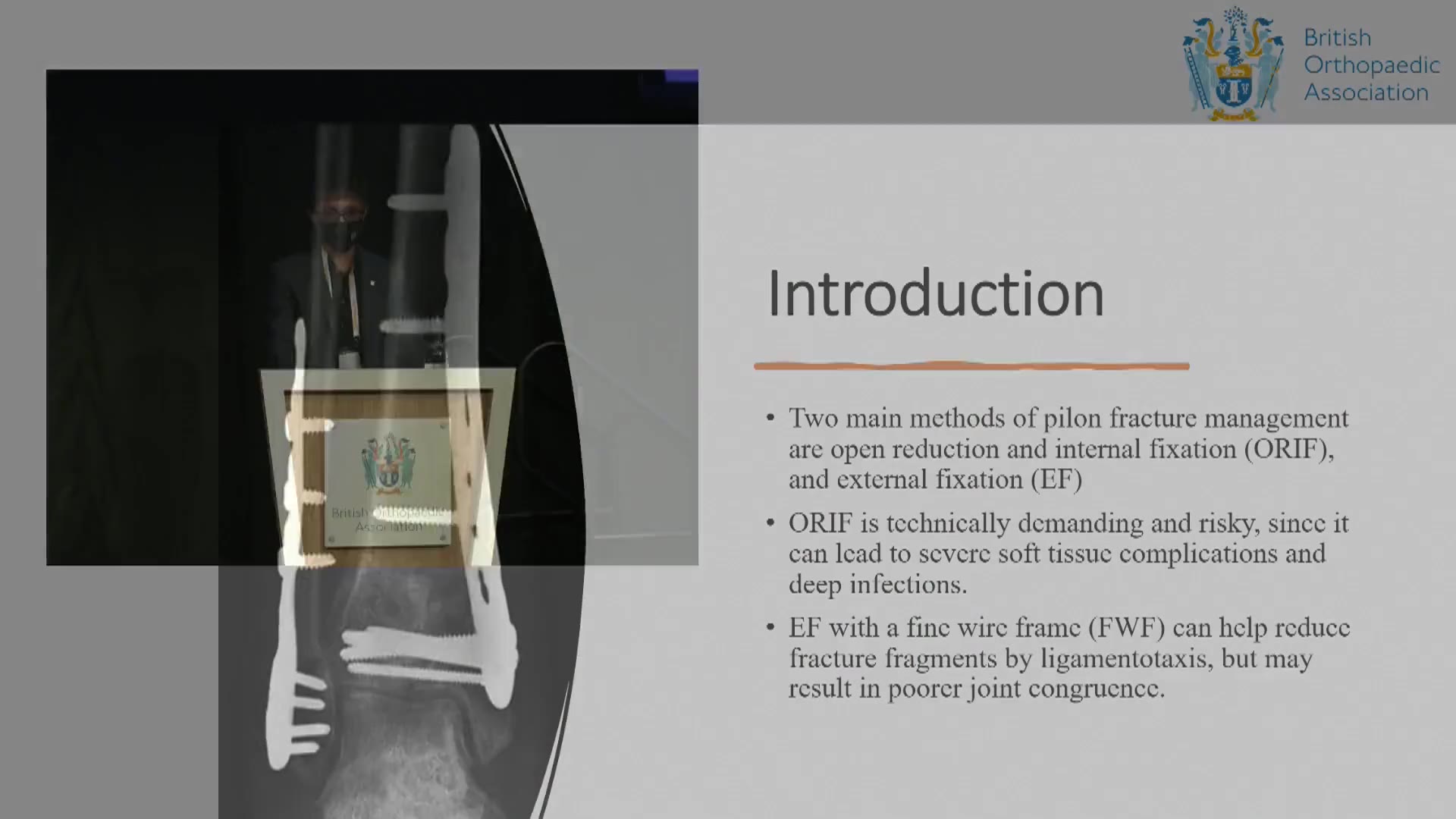 In this medical presentation, Victor Lu, a fifth-year medical student from the University of Cambridge, discusses the treatment outcomes of open and closed pilon fractures using a consistent treatment algorithm. He highlights the challenges of managing these high-impact injuries and the importance of surgical techniques, namely open reduction and internal fixation (ORIF) and external fixation with a fine wire frame.