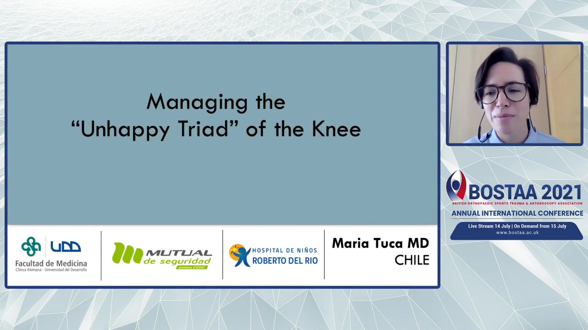 This presentation by Dr. Maria Tuca, a knee surgeon from Chile, focuses on the "unhappy triad" of knee injuries, which comprises tears to the anterior cruciate ligament (ACL), medial collateral ligament (MCL), and the medial meniscus. Dr. Tuca outlines the anatomy and biomechanics of the knee, emphasizing the interdependence of these structures in maintaining stability against valgus and rotational forces. The rise in failure rates of ACL reconstructions tied to residual medial laxity and untreated medial meniscal tears is highlighted, along with statistics indicating the commonality and variations of these injuries. Dr. Tuca reviews historical perspectives and shifts in understanding from earlier studies to contemporary research that suggests a potential tetrad injury including anterolateral complex injuries. The presentation stresses the importance of thorough physical examinations, appropriate imaging techniques, and stress tests to assess the extent of injuries, while proposing treatment algorithms that consider the healing potential of medial injuries as well as surgical options for more severe cases. It concludes with insights on rehabilitation protocols designed to reduce complications like arthrofibrosis and future research directions aiming to refine surgical intervention criteria.