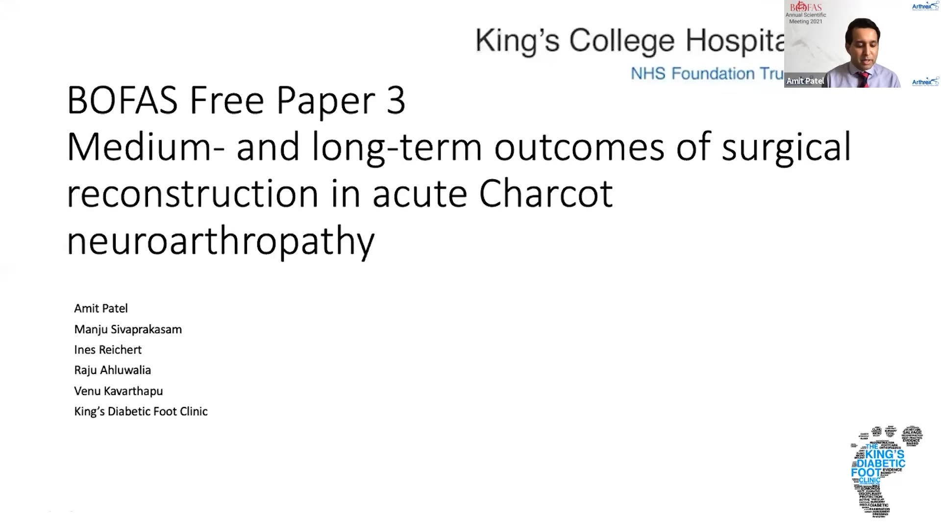In this presentation, Amit Patel, a foot and ankle fellow at King's College Hospital, discusses the challenges of managing acute Charcot neuroarthropathy, particularly in diabetic patients. He outlines the typical initial treatment approach, which includes non-weightbearing methods like total-contact casts, to promote bony consolidation. However, he notes that some patients may present with significant deformity, instability, and ulceration, indicating a 'foot at risk' that may require early surgical intervention to prevent amputation.