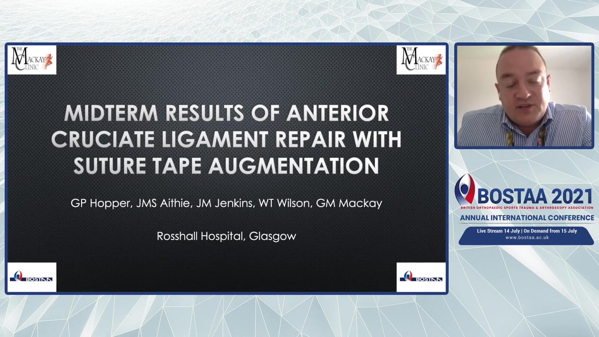 The video transcript features a presentation by Graeme Hopper, an orthopedic surgeon, discussing the findings from his study on the outcomes of anterior cruciate ligament (ACL) repair using suture tape augmentation. In this study, conducted following his recent orthopedic training in Scotland, Hopper introduces the work's objective of analyzing patient-reported outcomes after a minimum of two years post-surgery.