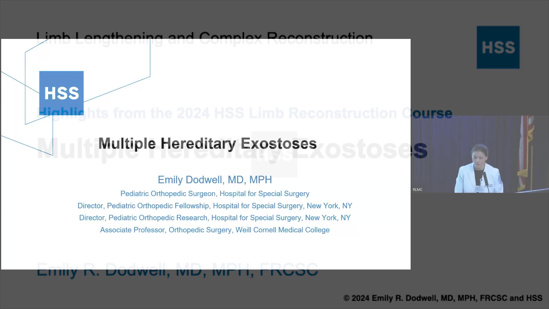In this presentation, Emily Dodwell provides an in-depth overview of Multiple Hereditary Exostoses (MHE), detailing its definitions, causes, epidemiology, clinical manifestations, classification, screening, treatment options, and outcomes. MHE, also referred to as hereditary multiple osteochondromas, is characterized by the presence of multiple osteochondromas, which are benign lesions on the bone surface. The speaker explains the genetic basis for MHE, noting that it is an autosomal dominant condition, primarily associated with mutations in the EXT-1 and EXT-2 genes. The incidence of MHE is approximately 1 in 50,000, with some populations showing higher prevalence.