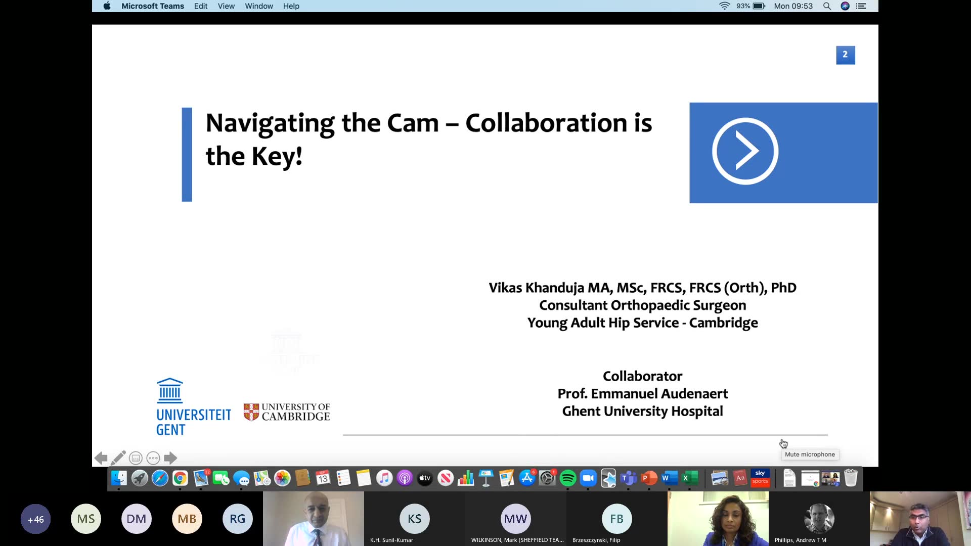 The VTT transcription captures a presentation by Dr. Vikas Khanduja, in which he discusses his decade-long journey in hip surgery focusing on the concept of femoroacetabular impingement (FAI) and its implications for early osteoarthritis of the hip. Dr. Khanduja expresses gratitude for the opportunity to speak and addresses a technical issue at the beginning. He reflects on pivotal moments starting from a SICOT meeting in Gothenburg in 2010, where he met Professor Emmanuel Audenaert, which led to fruitful collaboration.