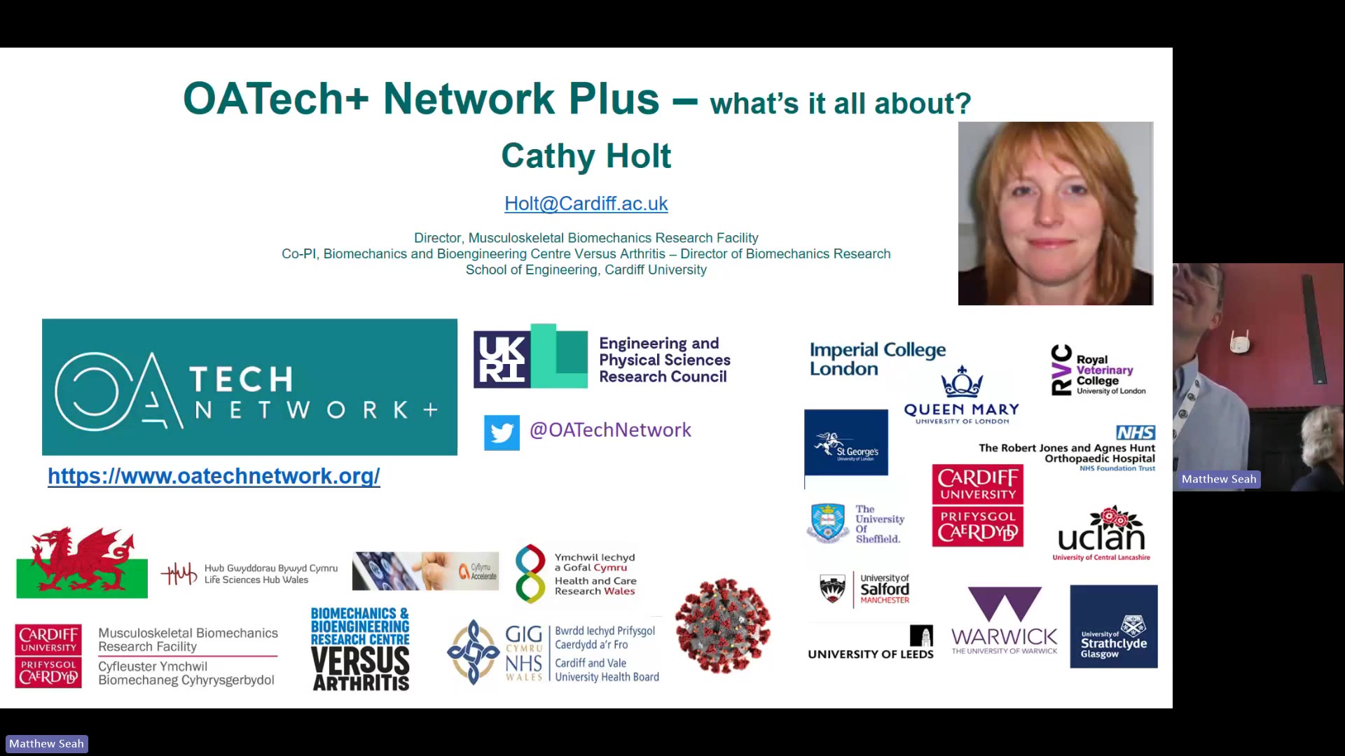 The session was introduced by Mark Elliott, welcoming attendees back from lunch and outlining the agenda set forth by the OATech Network. Deborah Mason from Cardiff University took the stage to present an overview of the OATech initiative, a project funded by EPSRC aimed at enhancing osteoarthritis research involving multidisciplinary collaborations among various scientists and clinicians across the UK.