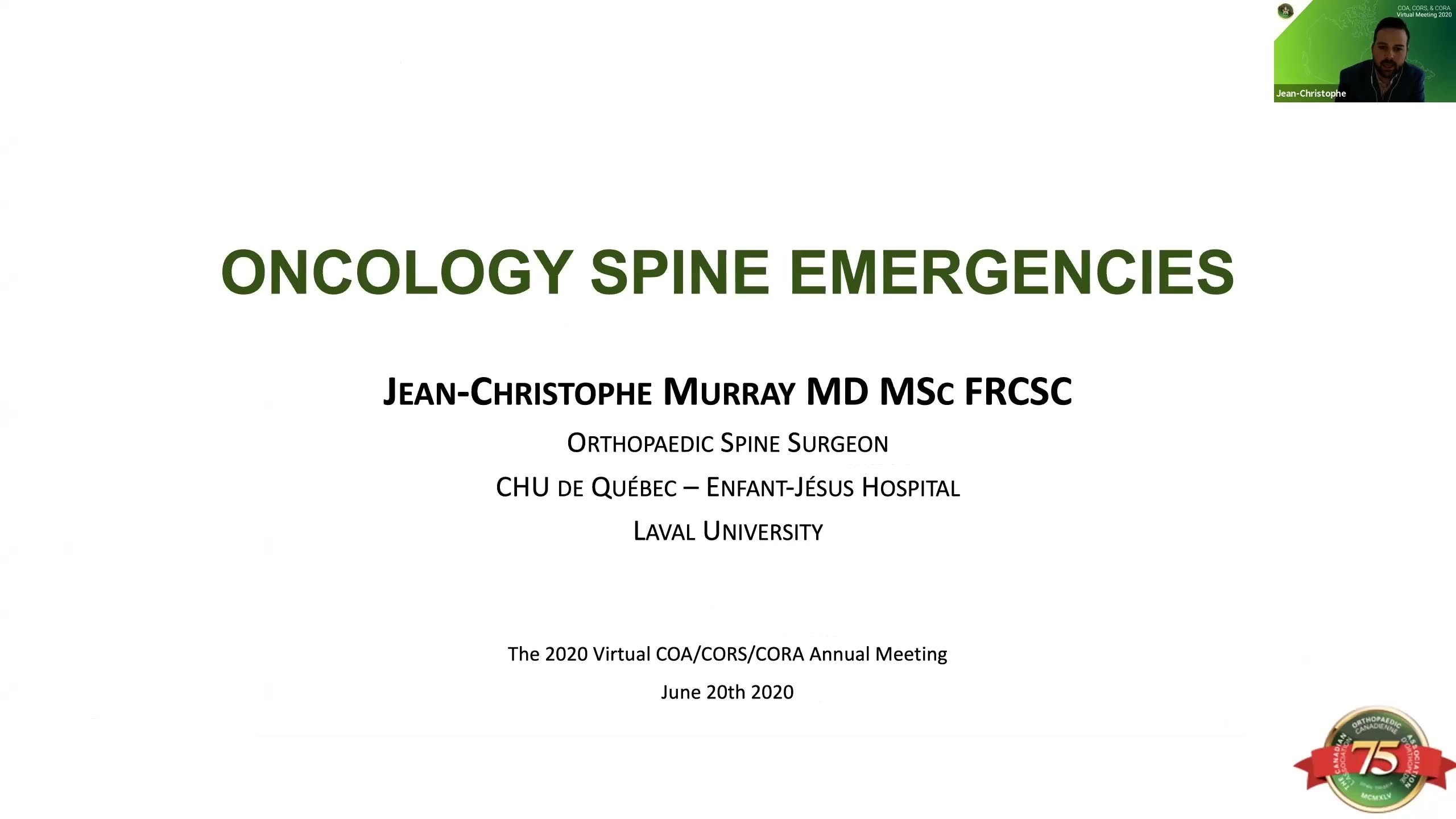 The presentation focuses on oncology spine emergencies, specifically dealing with acute neurological deficits related to spinal metastasis. The speaker, Jean-Christophe Murray, introduces a clinical case of a 69-year-old male patient, an active smoker, who experienced generalized neck pain for three months and presented with acute paralysis indicating vertebral involvement due to a large C6-C7 lytic lesion accompanied by spinal cord compression. Murray outlines the challenges faced in diagnosing such conditions when encountering patients without a previous cancer history, emphasizing the necessity of obtaining tissue diagnoses before surgical intervention. The talk also evaluates the use of corticosteroids (dex) for reducing edema in the spinal cord and tumor size, particularly in patients with myeloma or lymphoma. It concludes by stressing the importance of thorough workups, timely biopsies, and appropriate patient selection for surgery, highlighting that some patients can still lead independent lives post-operation if managed correctly.