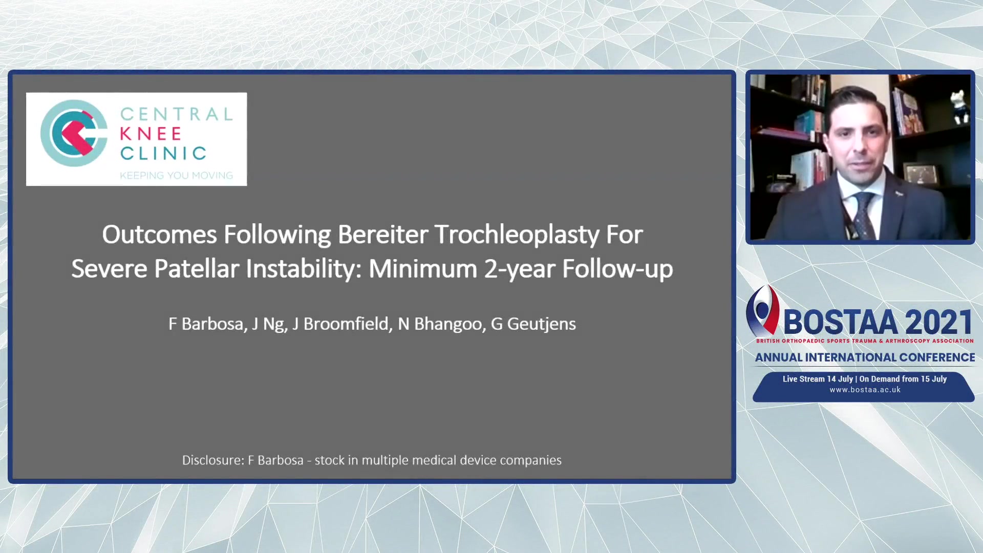 This document features a presentation by Francisco Barbosa, an orthopedic registrar at Royal Derby Hospital, focusing on a study of Bereiter trochleoplasty for severe patellar instability with a minimum follow-up of two years. Barbosa begins with an introduction, outlining the significance of trochlear dysplasia as a key contributor to recurrent patellar instability, potentially leading to joint damage and osteoarthritis.